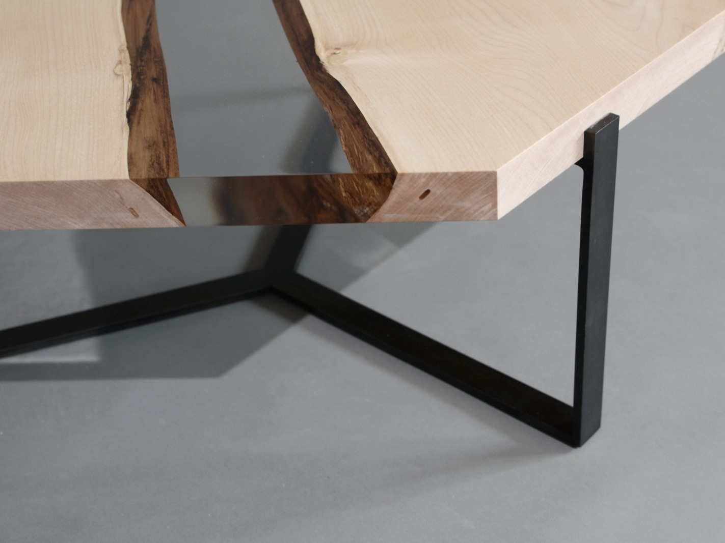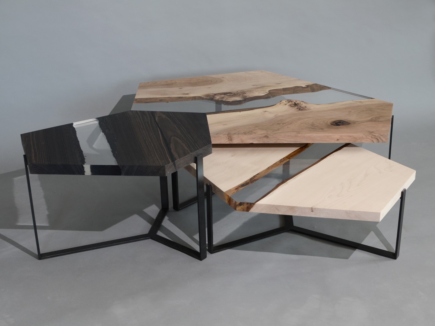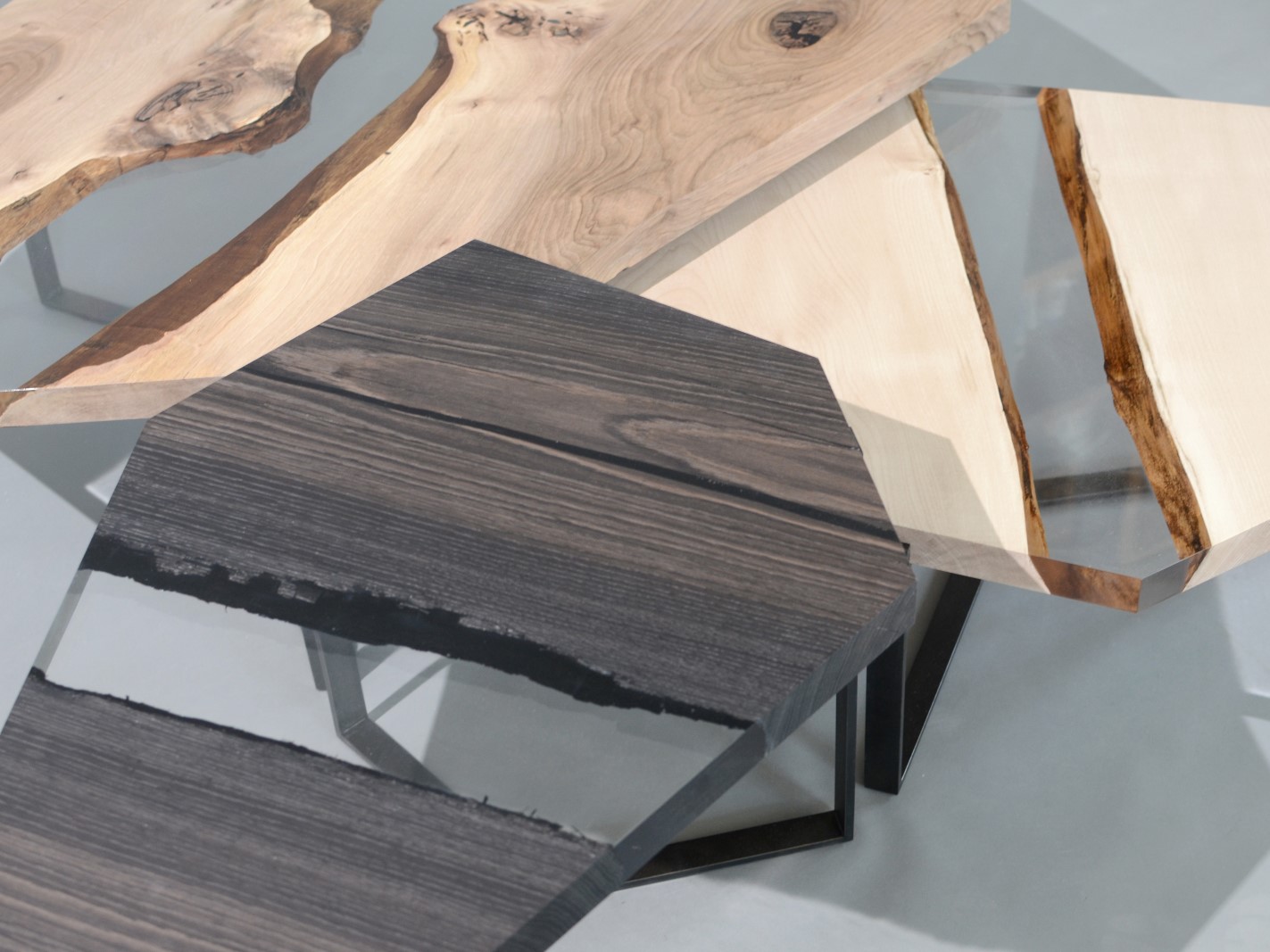 A special crystalline resin fill the gaps between the wood live edges completing the prisms and preserving their story.