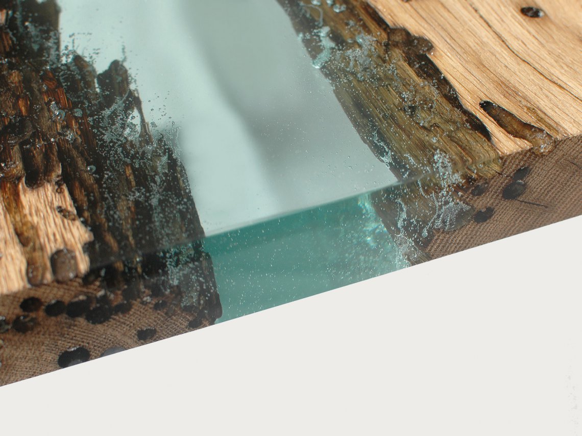Jetty is a meeting place, a surface area of ??transition between liquid and solid. A floating space where wood and water are spoken, whispering incessantly, like waves raised by the boats that dock. alcarol has patented an elaborate and patient craftsmanship capable of filling only the empty spaces of the wood with a transparent resin and capturing the underwater air bubbles that bring the Venetian wood back to the original look and conditions.