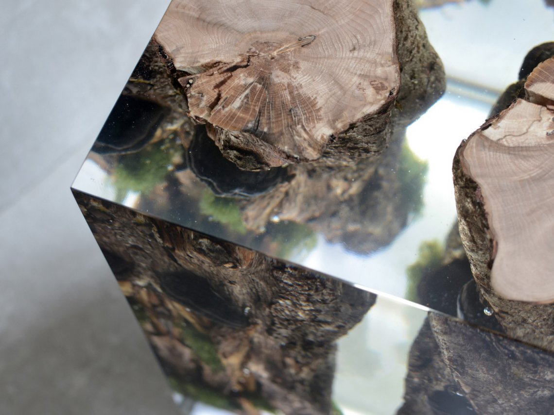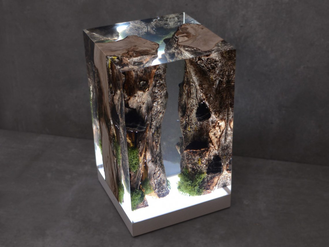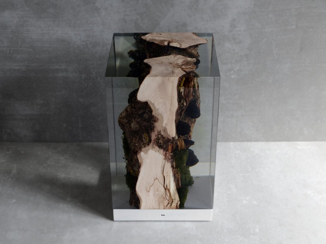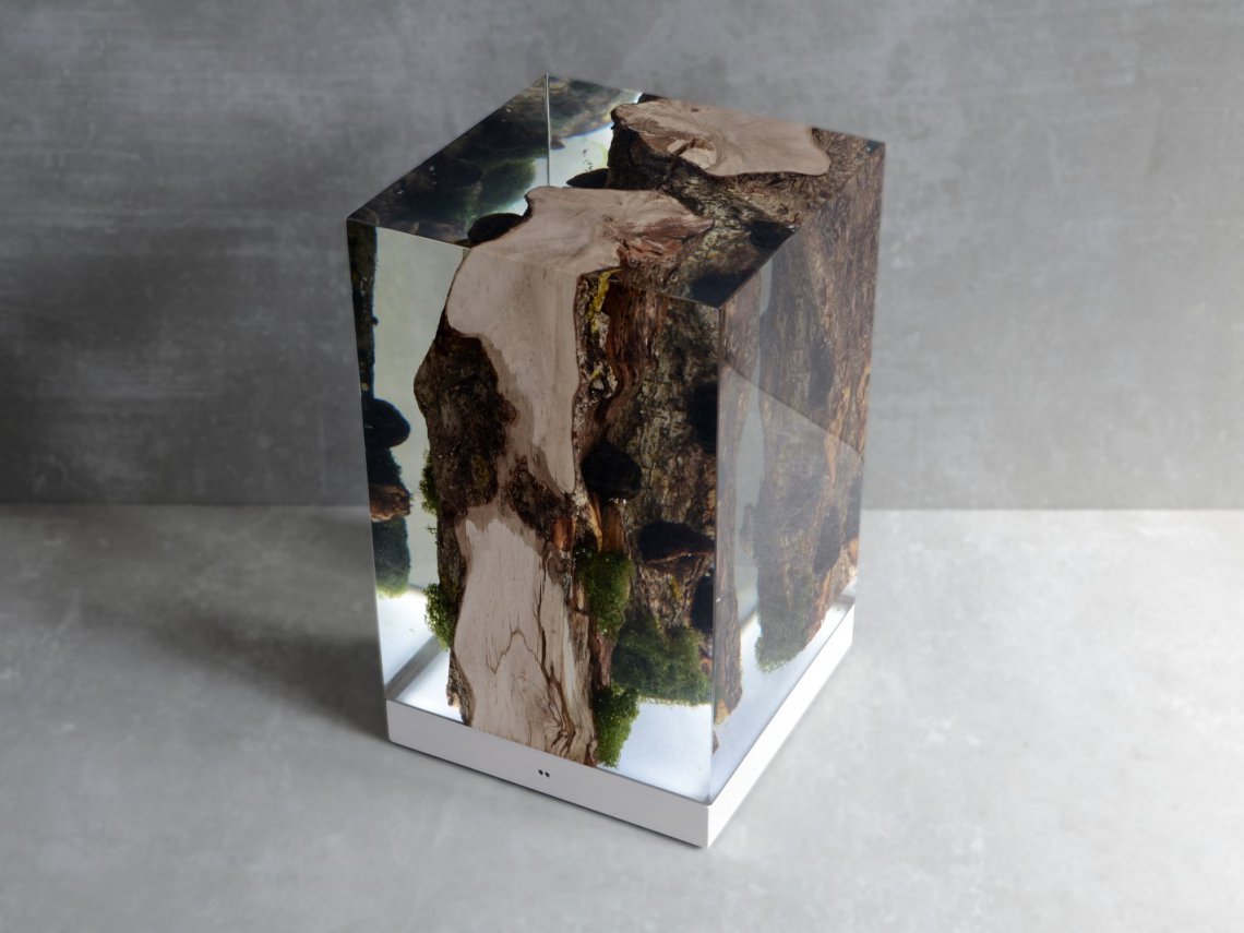 Created by some logs from the undergrowth of the Italian Dolomite mountains, alcarol has conceived Moss Lamp preserving the natural edges of the wood with their native populations of mosses, which are embedded in a resin resembling the water that generated their life.