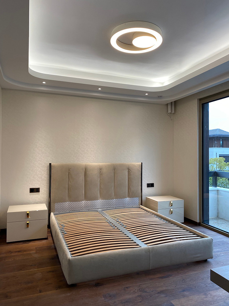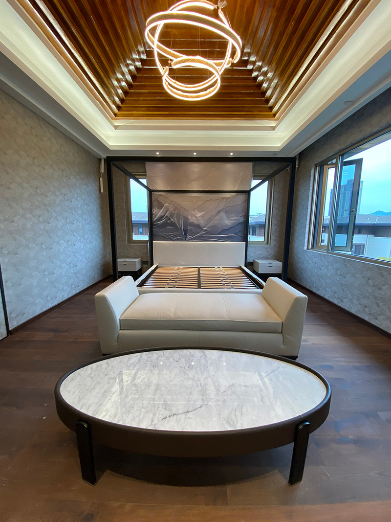 最愛的就是屋子的主臥了:中式屋頂下卻掛著三圈華麗的光環,中式架子床背靠的是極簡的山水水墨畫,另一頭卻是西式床尾凳和大理石咖啡桌,中西風格完美碰撞著、融合著