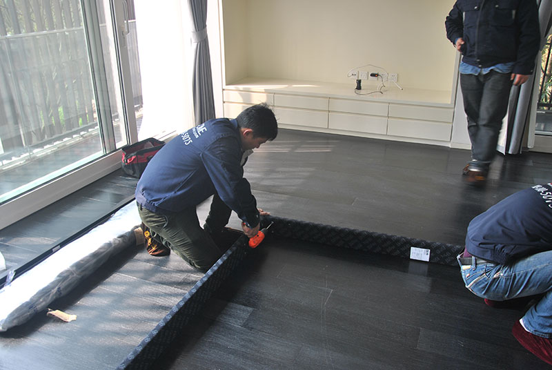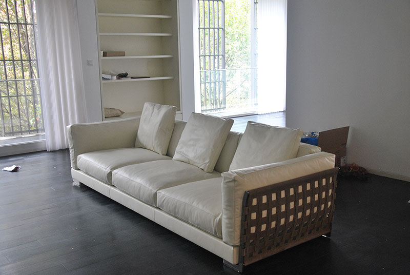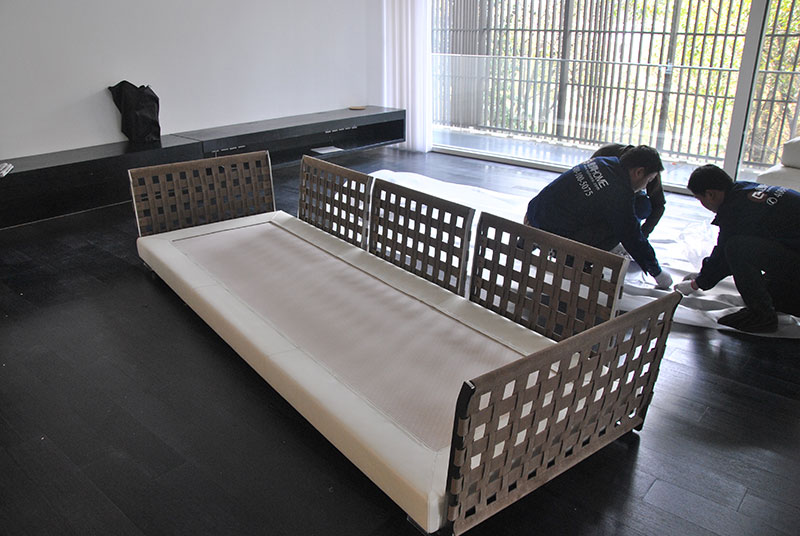 意俱施工團隊帶著專用手套,在組裝FLEXFORM沙發(fā)。
