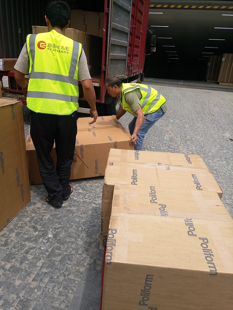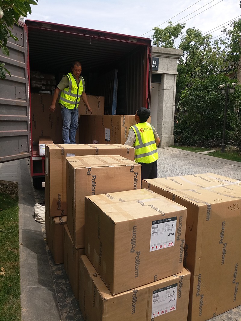 經(jīng)過前期路勘工作,意俱home團隊將車隊停在小區(qū)門口準(zhǔn)備卸貨。