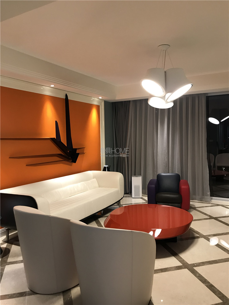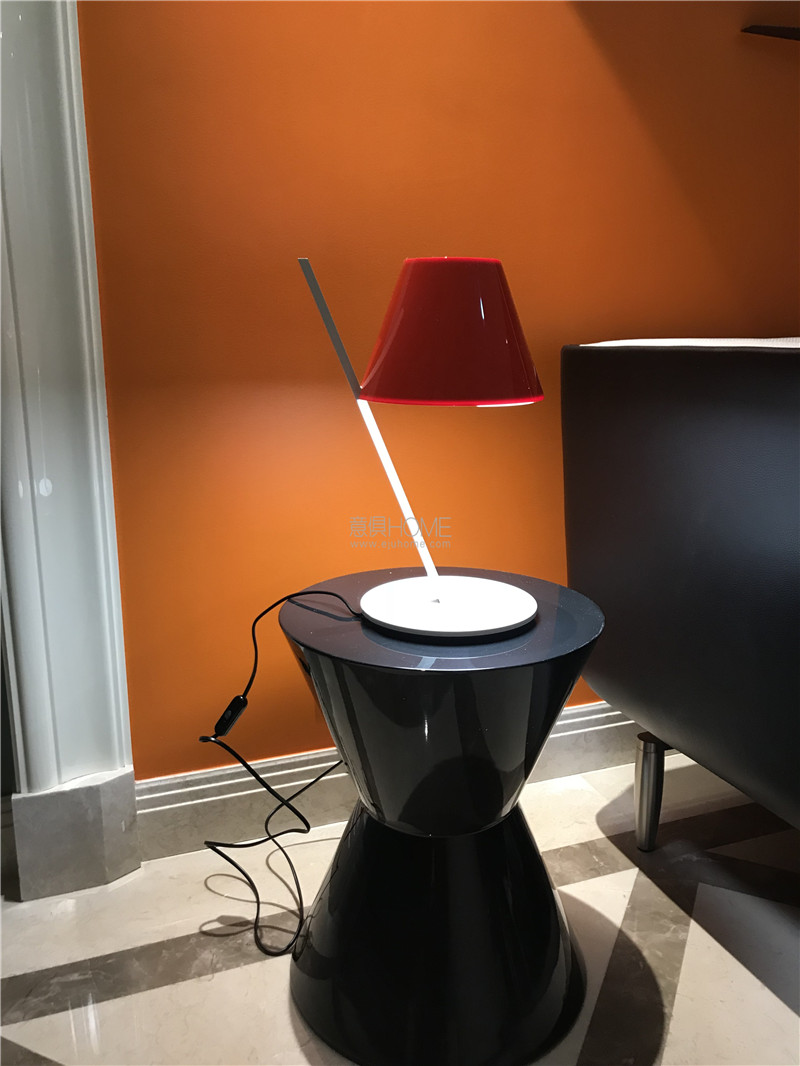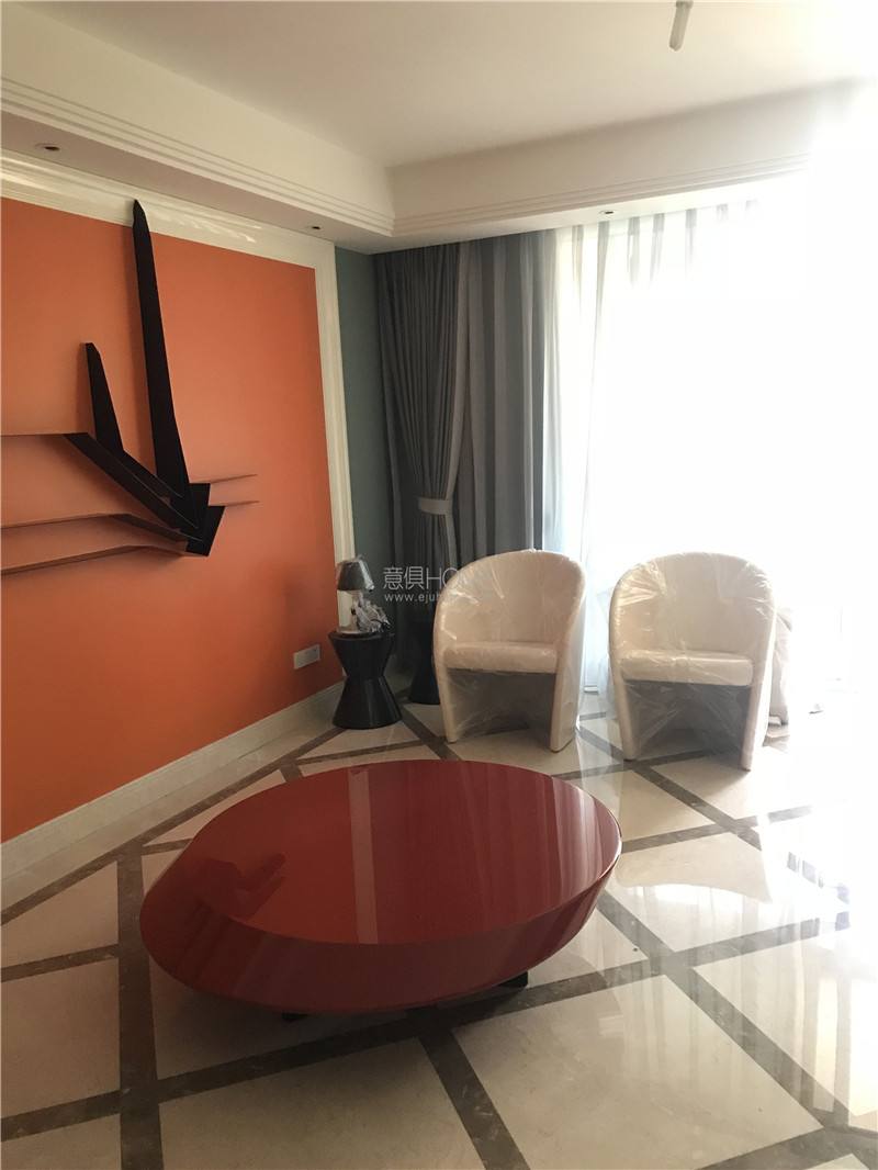 紅色亮光漆臺面加上黑色啞光漆底座,橢圓形的茶幾面充滿設計感,大紅的顏色與橘色的墻面完美融合。