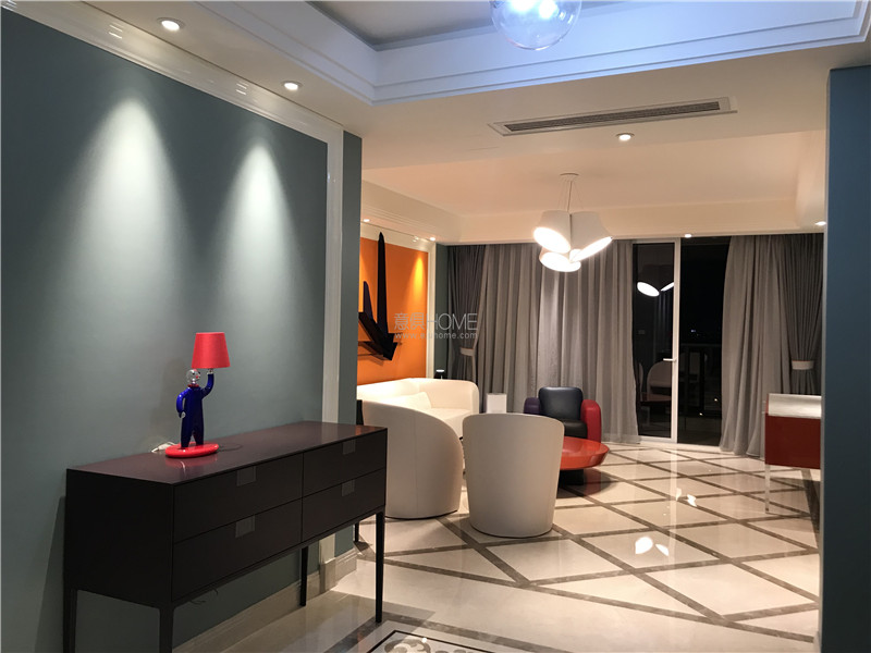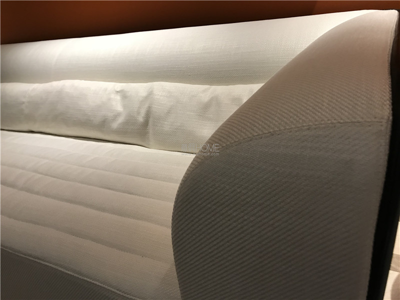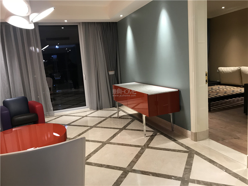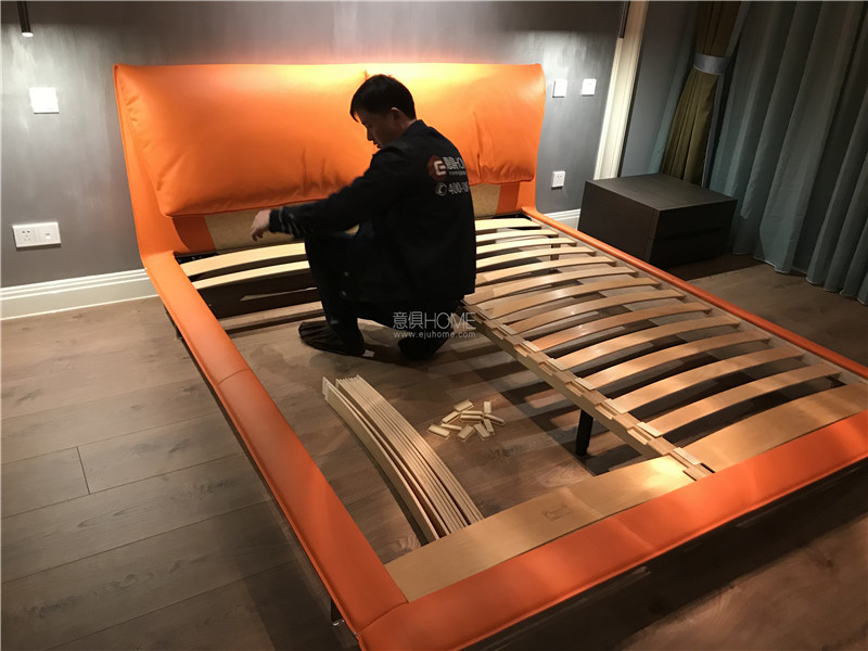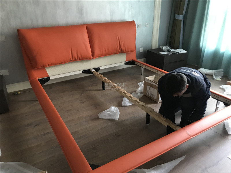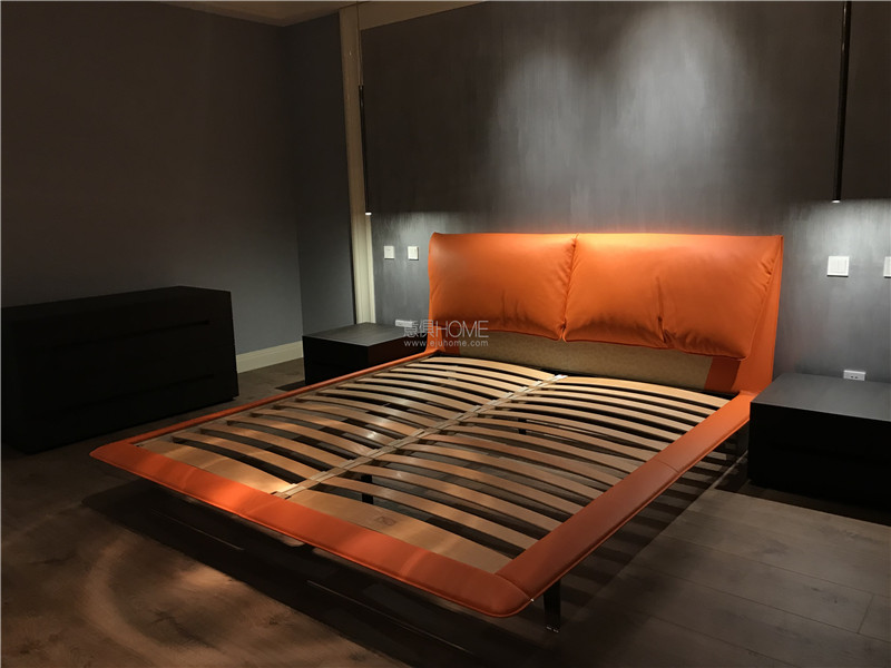 這是POLTRONA FRAU 的 JOHN-JOHN床,在顏色上客戶選擇了與客廳墻面相同的橘色,光滑的高級皮質在燈光下顯得更加有質感。