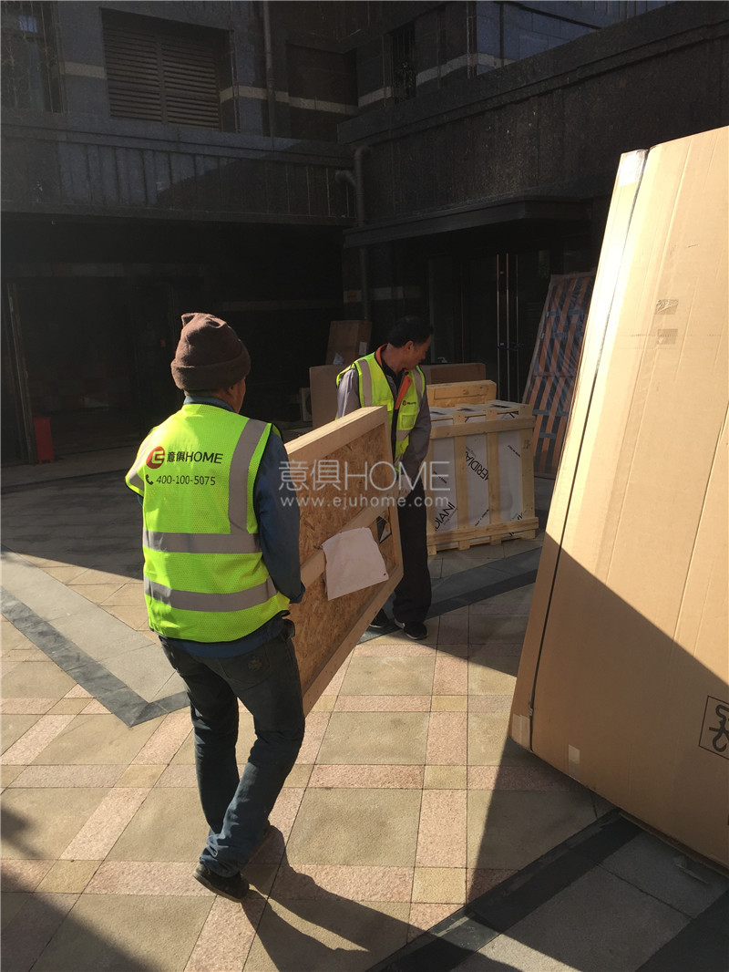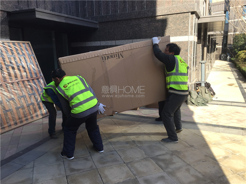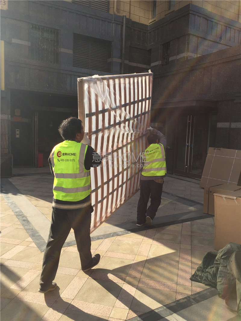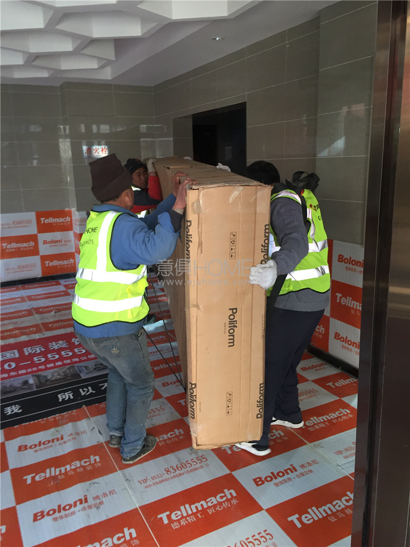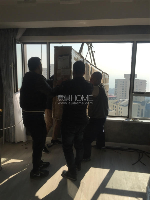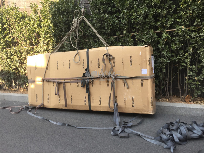 作為大件物品的Poliform床,由于無法通過電梯搬運,意俱團隊選擇吊裝。