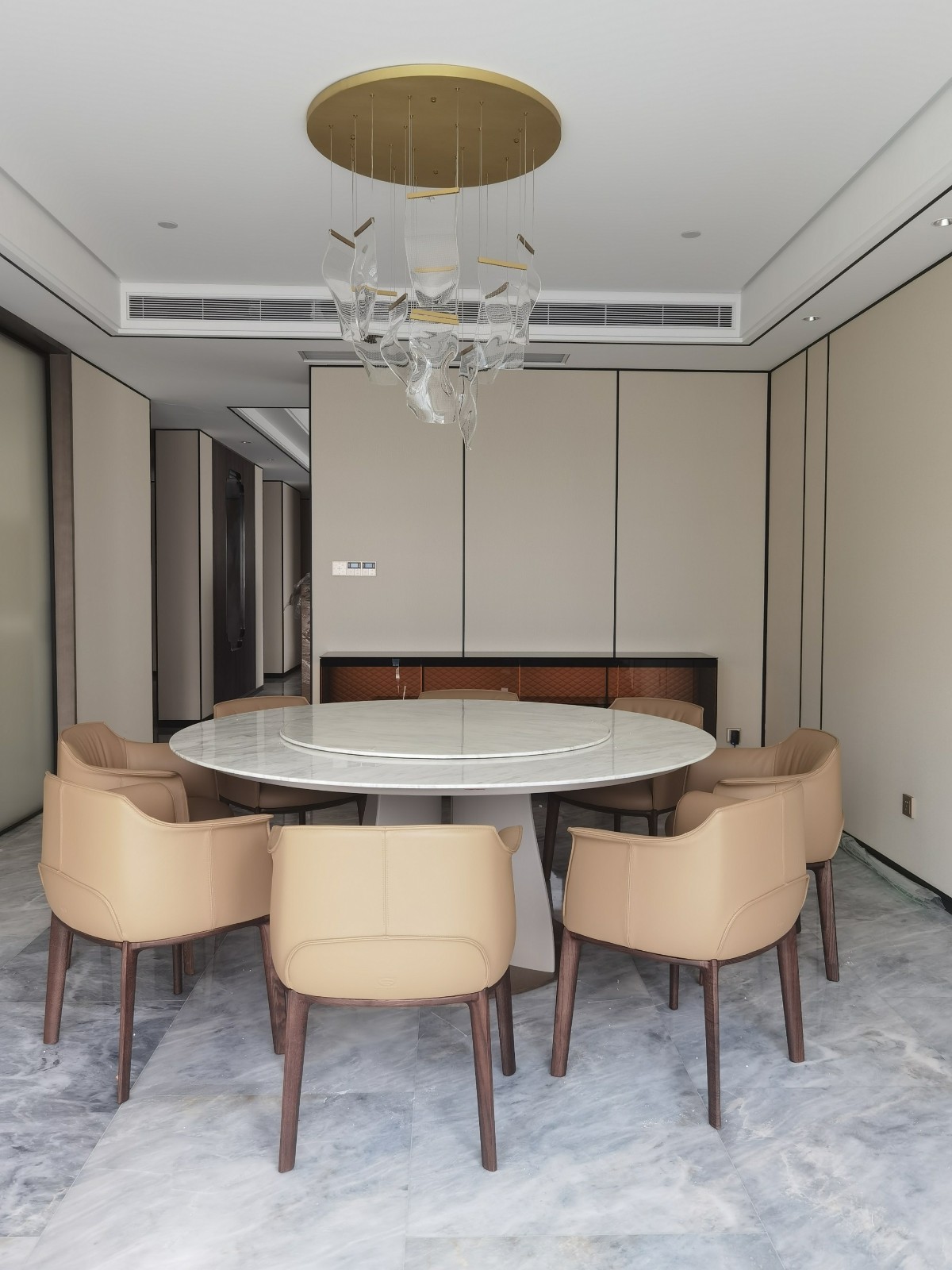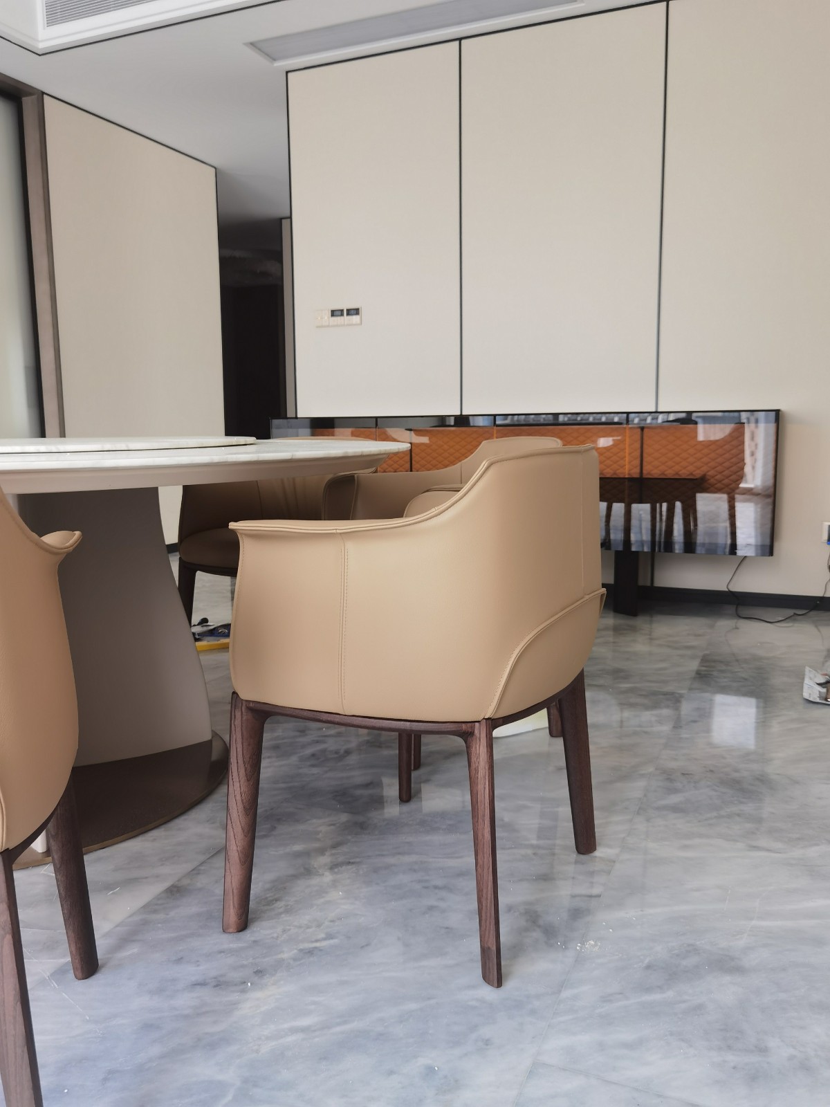 餐廳的主角的Poltrona Frau的經典餐椅Archibald Dining Chair系列,這款餐椅采用縫紉感設計,每個細節都彰顯細致柔和,從華麗繁復的褶皺可見一斑。亦或者素雅低調的扶手,采用微敞的衣領造型,結合一股漫不經心之感,彰顯無法否認的從容優雅。亦或者是有意為之的撞色縫線,不動聲色地巧妙凸顯了背部和輪廓的曲線。