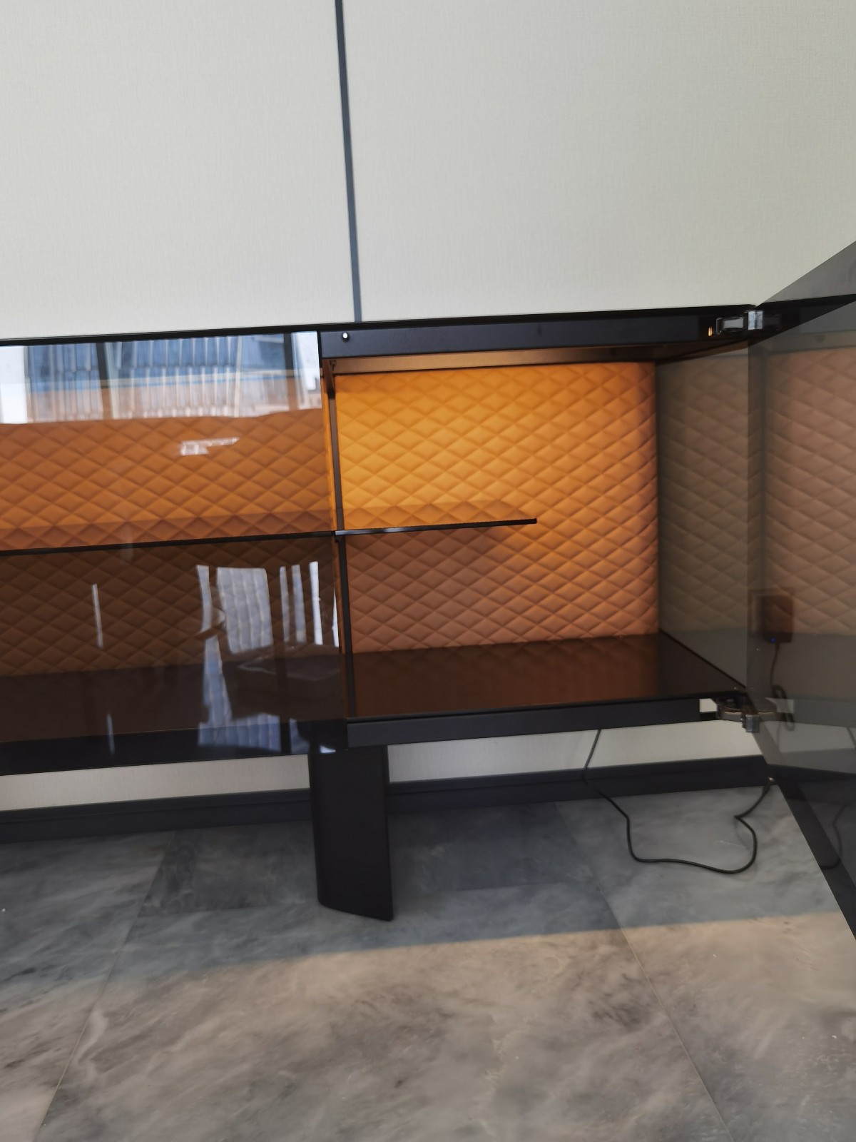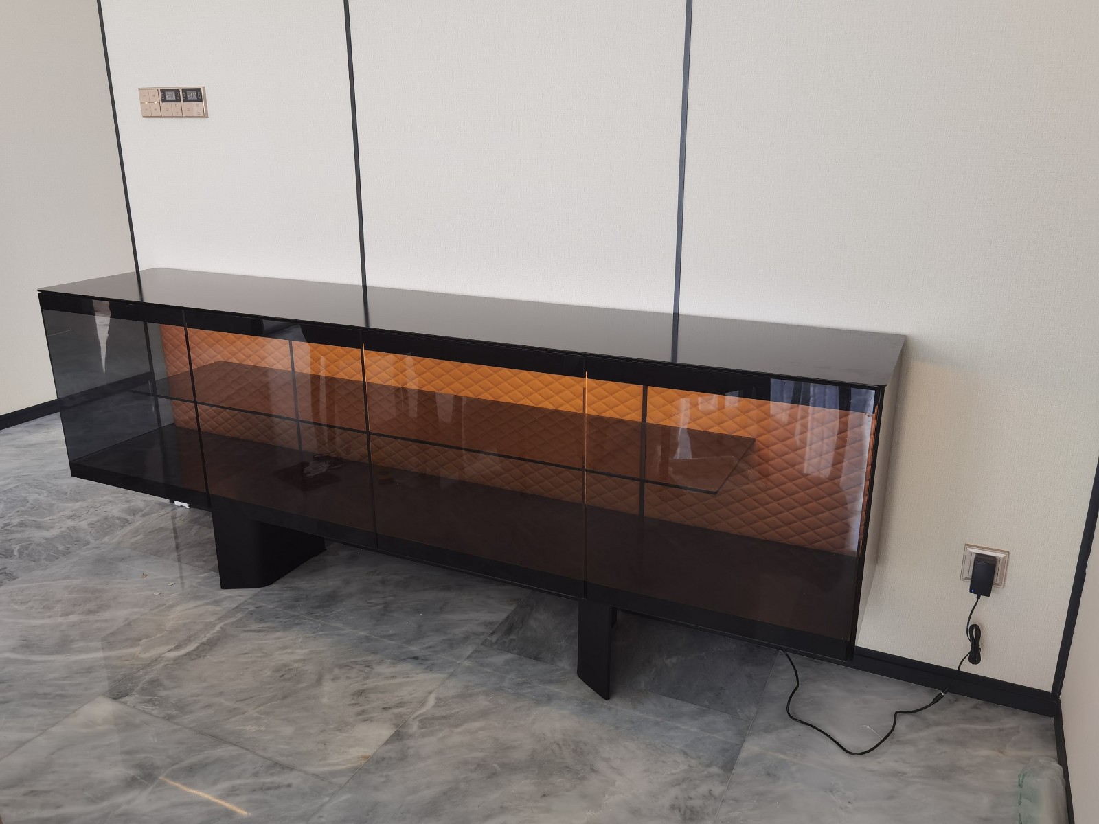 一旁的Cattelan Italia餐邊柜意外奪目,Boutique邊柜由設計師Alberto Danese完成,門和側面采用灰色透明玻璃制成,條紋為黑色彩繪玻璃。頂部和底部采用黑色涂層磨砂玻璃,觸感冰涼溫潤,透明玻璃柜門設計也使得內部空間一覽無余,方便了拿找東西。