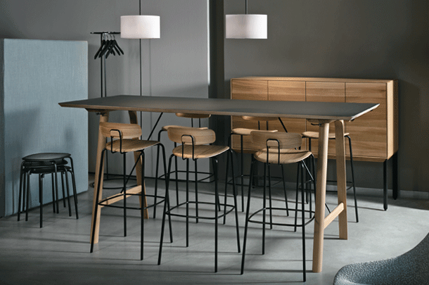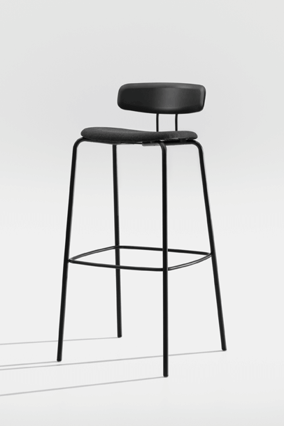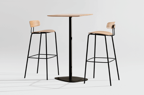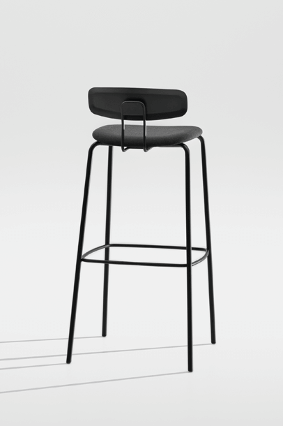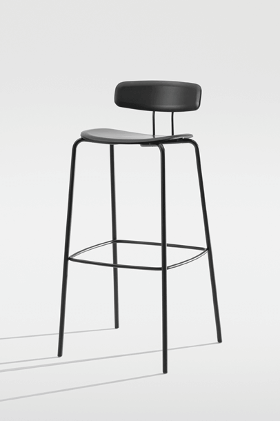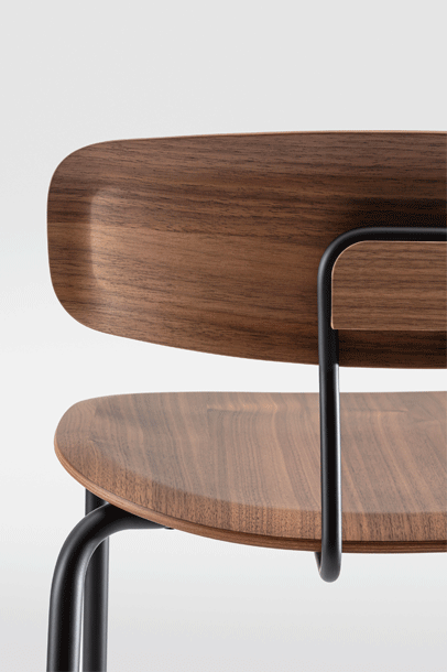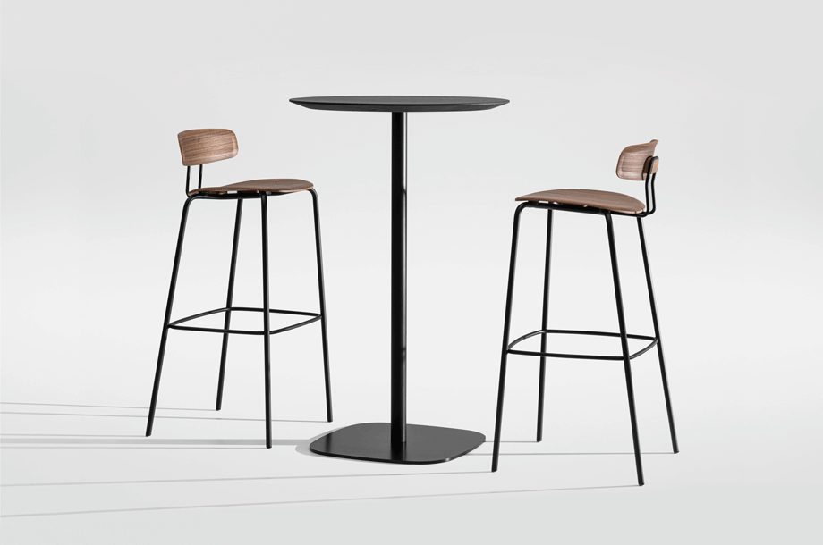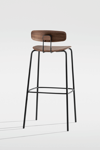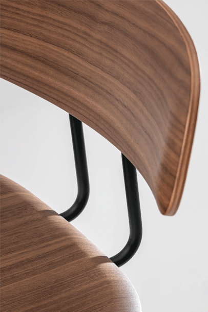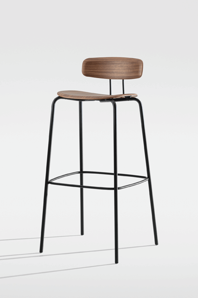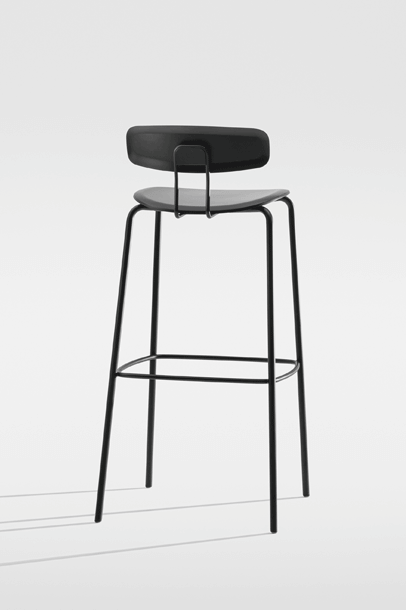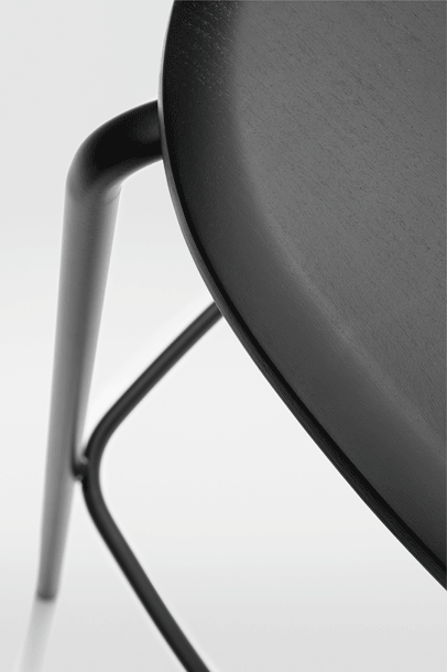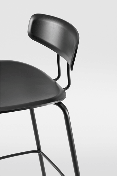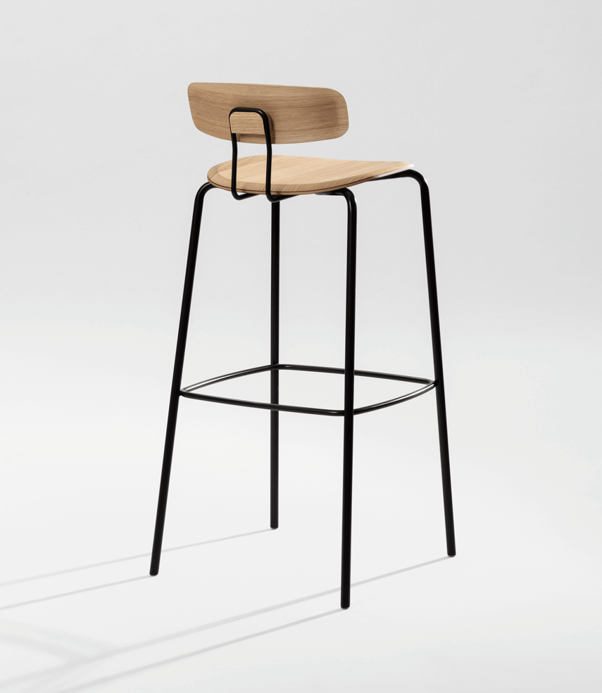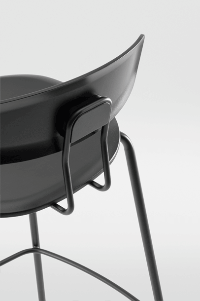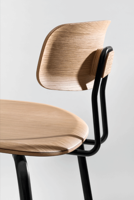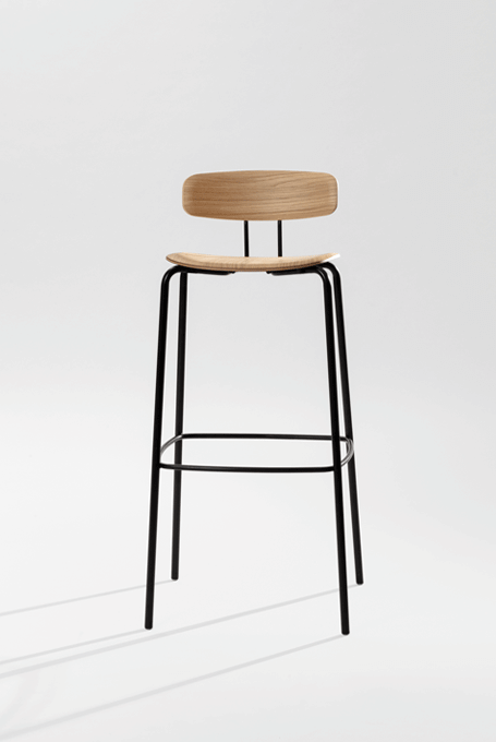 OKITO PLY BAR – reduction in wood & steel. The bar chair OKITO PLY BAR is available in seat height 80 cm. The focus therein lies on the reduced use of plywood and steel. This makes the barstool not only visually light, it is also. The backrest is attached to the chair without any visible screw connections and, thanks to the spring-loaded support, ensures high seating comfort. The molded wood elements are also ergonomically shaped and available in different materials. Despite its lightness, the OKITO PLY BAR is extremely stable and offers plenty of room for movement.