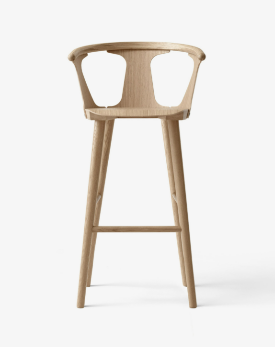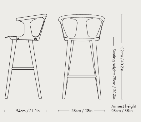 Veneer sheets formpressed together towards a solid wood insert. Milled into shape and lacquered. Natural Rattan weaved around a powder coated stainless steel frame.