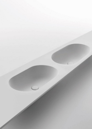 Mobile bagno porta lavabo con cassetto, top integrato e lavabo da appoggio, dimensioni da 140cm a 160cm. Piano integrato in Fenix con taglio a 45°. Lavabo in Cristalplant? Bio Active opaco modello Ciotola con copri piletta in Cristalplant? Bio Active, disponibile nelle versioni centrato, a destra e a sinistra del mobile. Basi del mobile con frontali e fianchi a 45°. I cassetti sono completamente estraibili e sono disponibili con maniglie opzionali a gola o premi apri.