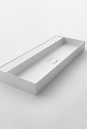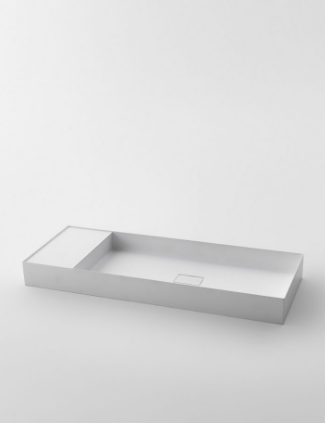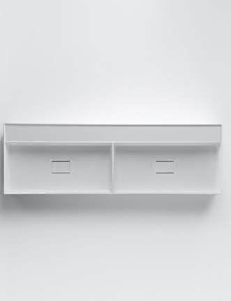 Mobile bagno porta lavabo con cassetto, top integrato e lavabo da appoggio, dimensioni da 140cm a 160cm. Piano integrato in Fenix con taglio a 45°. Lavabo in Cristalplant? Bio Active opaco modello Ciotola con copri piletta in Cristalplant? Bio Active, disponibile nelle versioni centrato, a destra e a sinistra del mobile. Basi del mobile con frontali e fianchi a 45°. I cassetti sono completamente estraibili e sono disponibili con maniglie opzionali a gola o premi apri.
