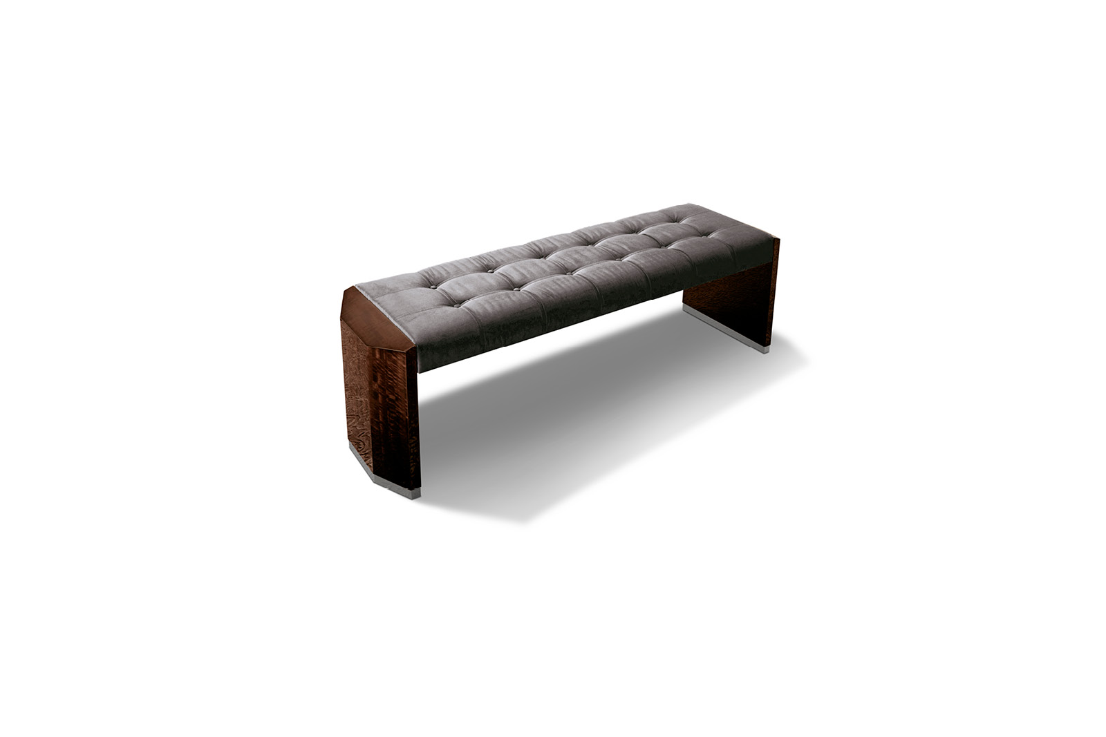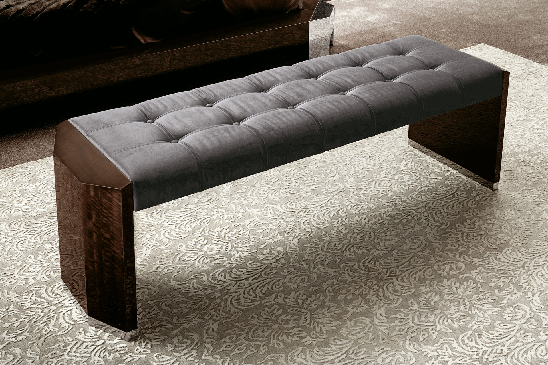 Bench in european curly eucalyptus veneer in high gloss polyester with buttoned seat in first grade leather, velvet or suede fabric. Chrome stainless steel feet.
