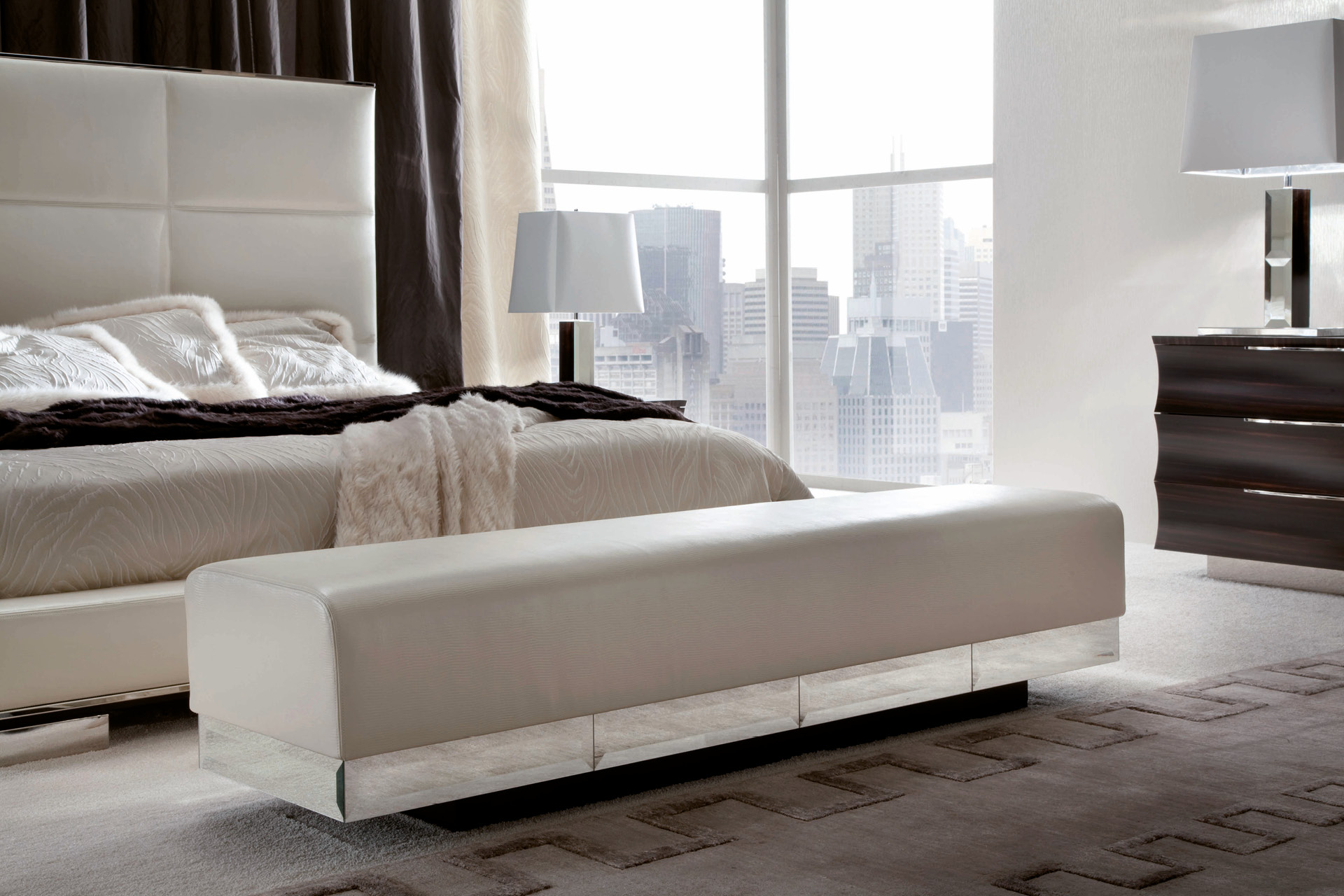 Bench available in first grade leather, nubuk leather, lizard printed leather, velvet or suede fabric. Base in beveled glasses.