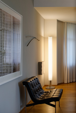 The indirect illumination of the standing light and the energy-saving lamp in the light body can be dimmed or switched on or off independently to create totally different light scenarios from powerful illumination to soft mood lighting. The light body itself shines a powerful but glare-free light through the opal film. The lower, semi-transparent part of the column imparts a floating and lightness of form to the light. The two smaller lamps at different heights can be used both as a table and as a floor light.