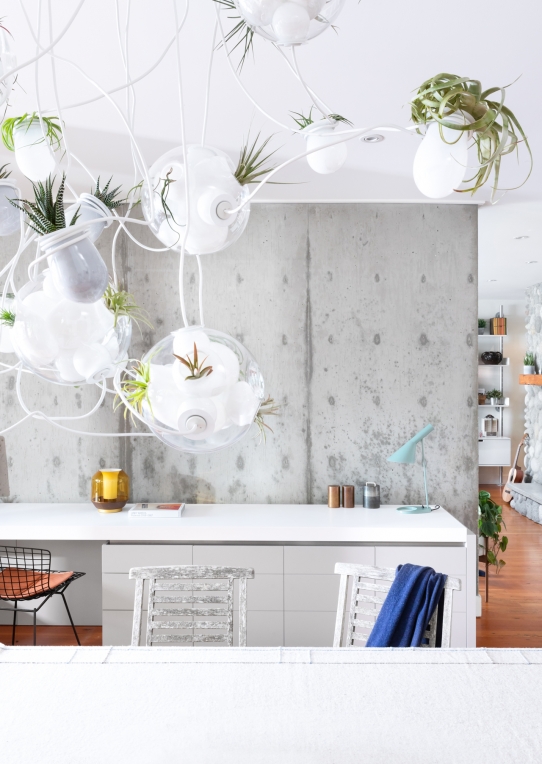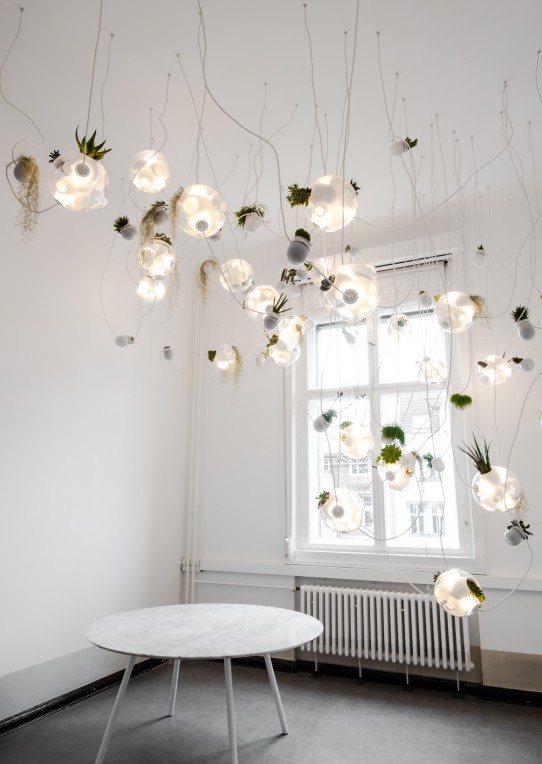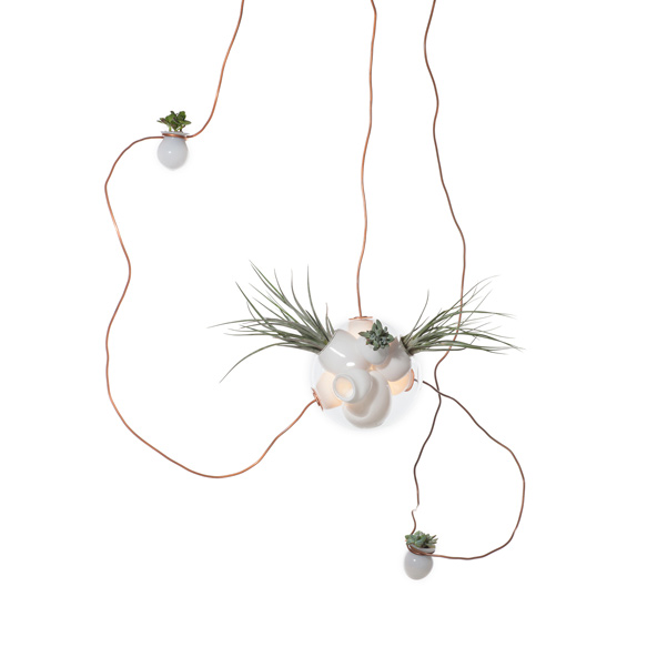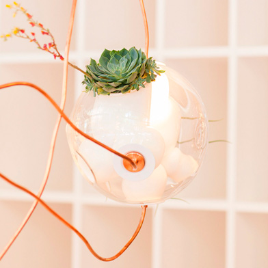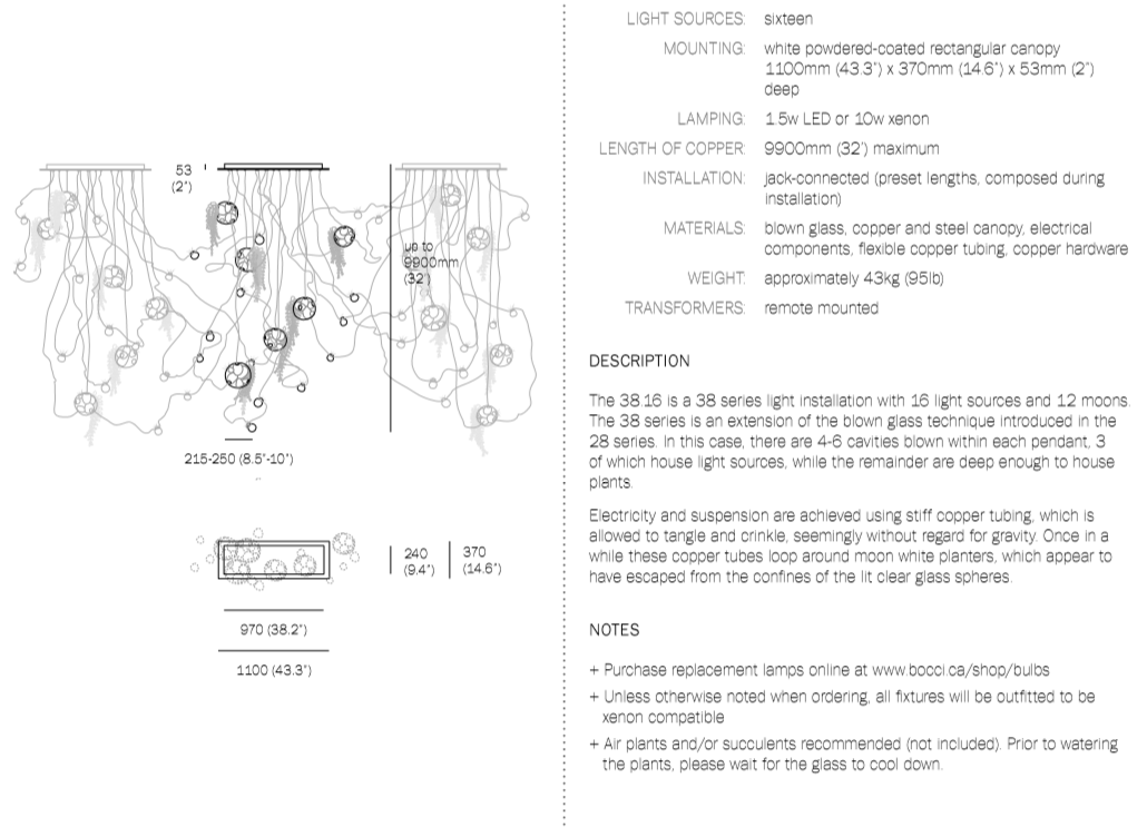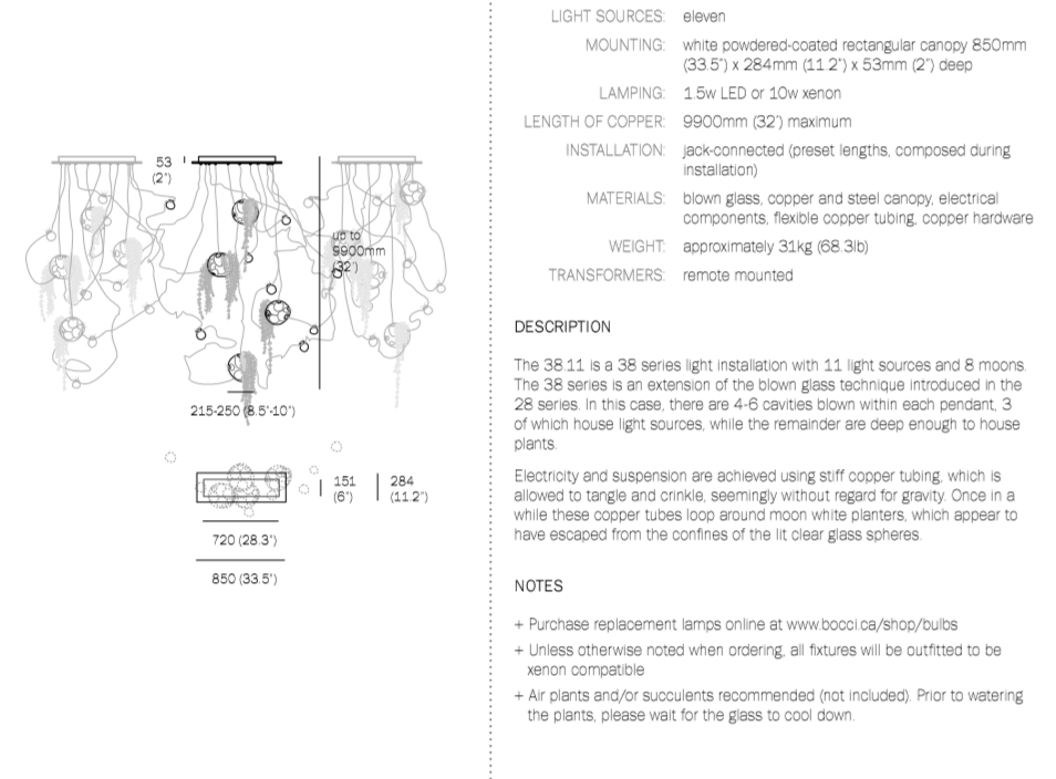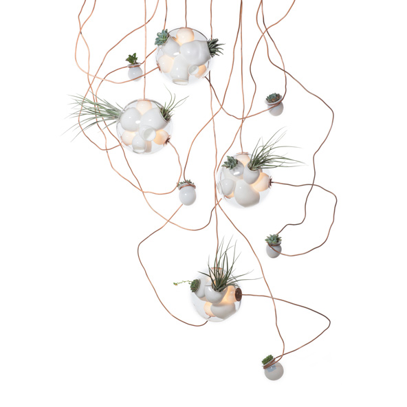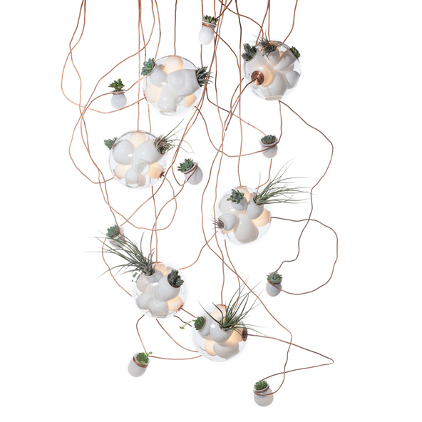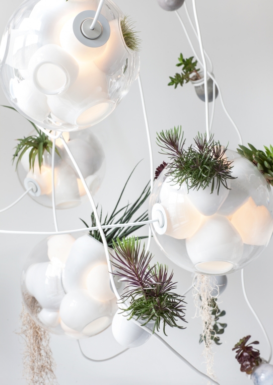 38 pushes the fabrication technique originally developed for 28 to its technical and material limits. A large glass sphere is blown with a multitude of haphazard interior cavities, which intersect and collide with each other in unpredictable ways. Several of these satellite cavities are deep enough to hold earth and succulent or cacti plantings, while others house lighting elements. Each 38 contains two or three lighting elements per large sphere, housing either a 10-watt xenon or a 1.5-watt LED lamp, and one or two planters.