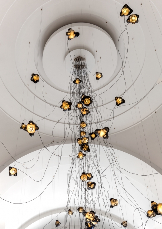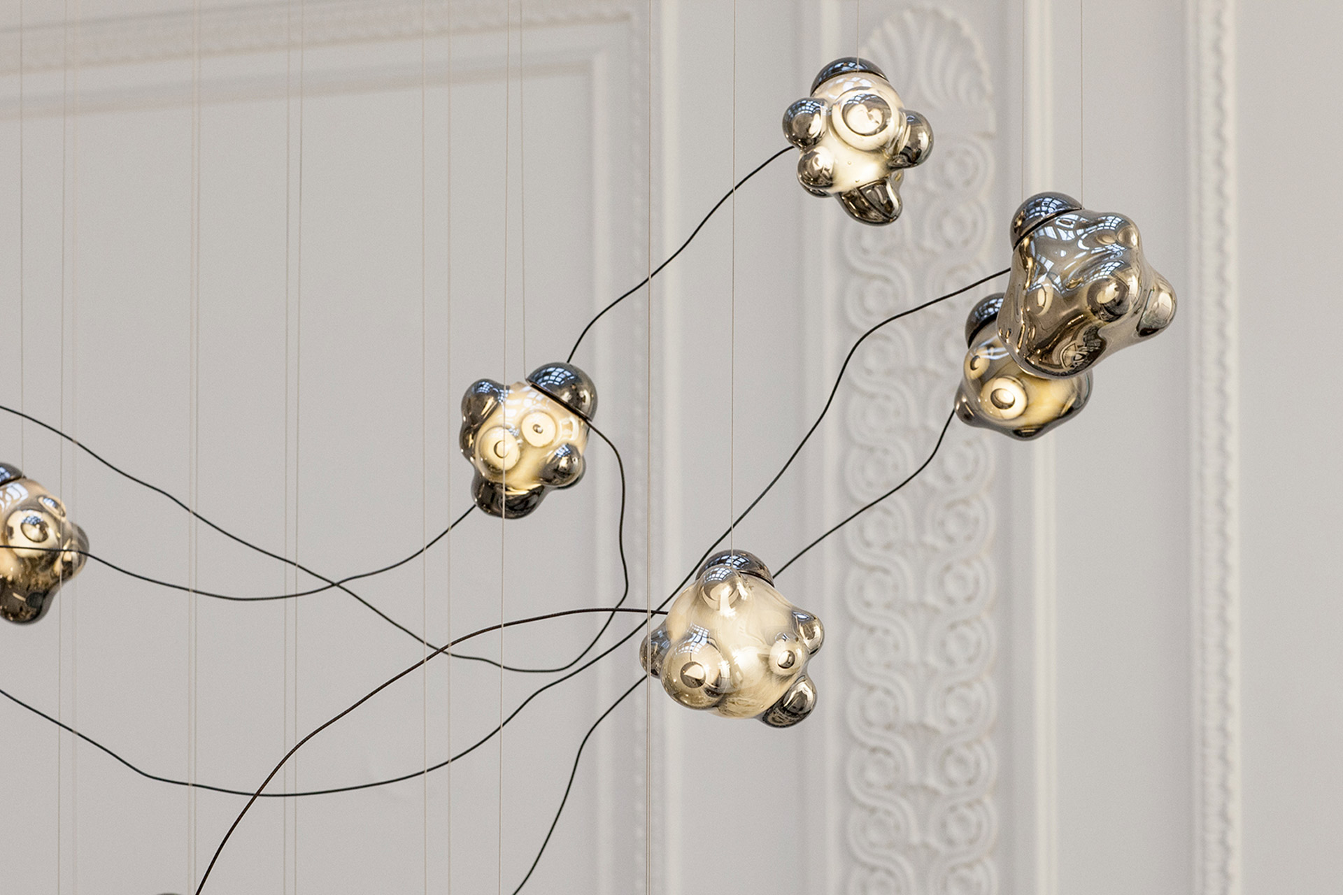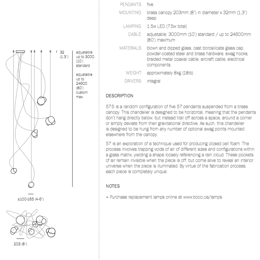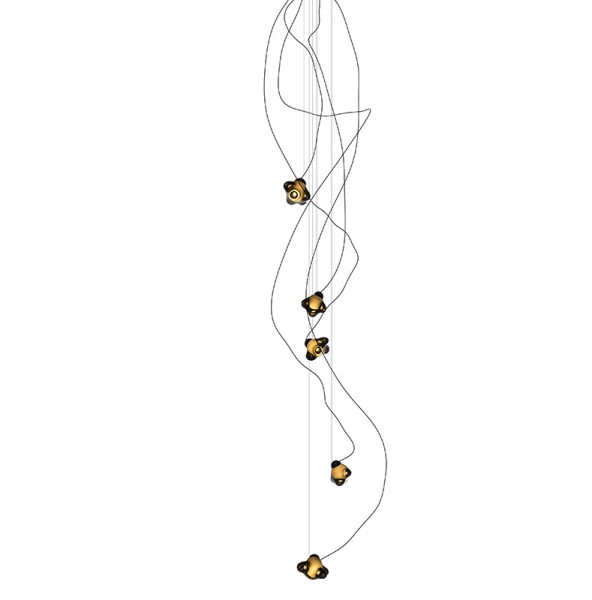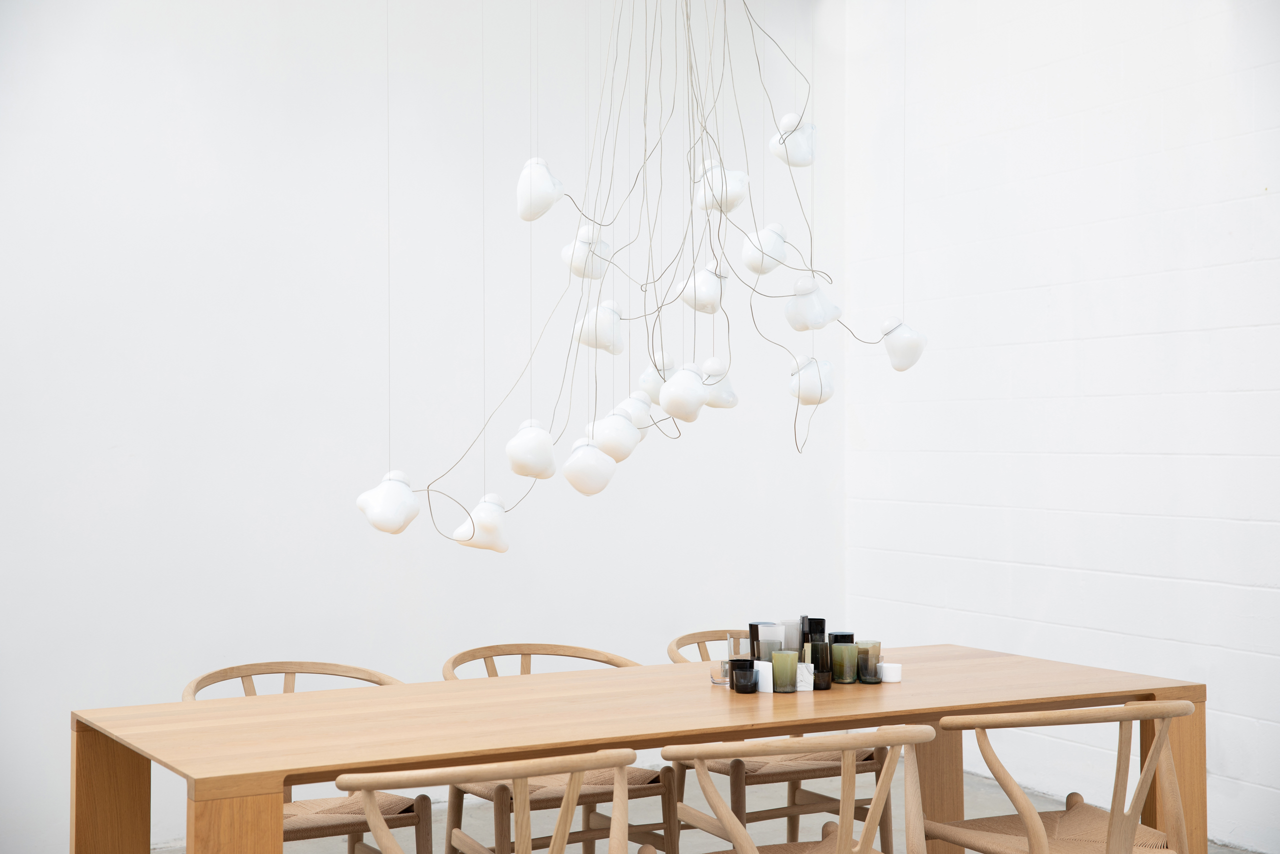 57 semi-rigid is a flexible suspension system enables pendants to be nestled in close-knit groups or loosely composed in a wider field, allowing each piece to be perceived individually.