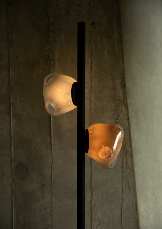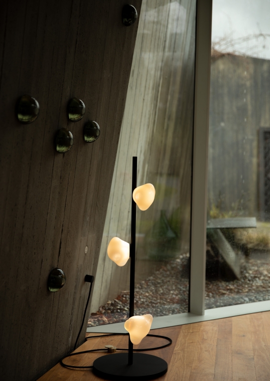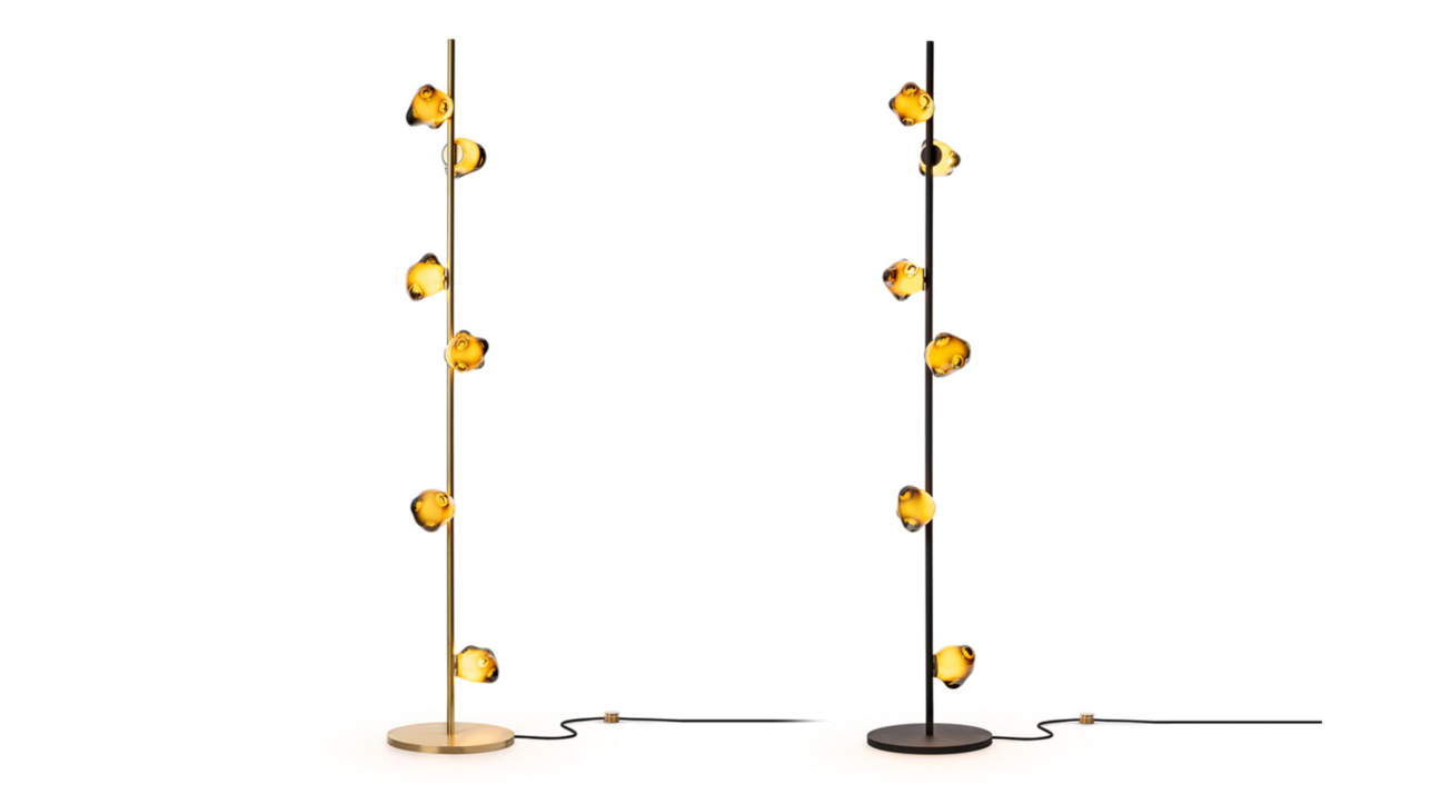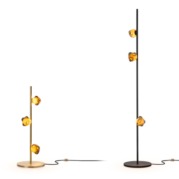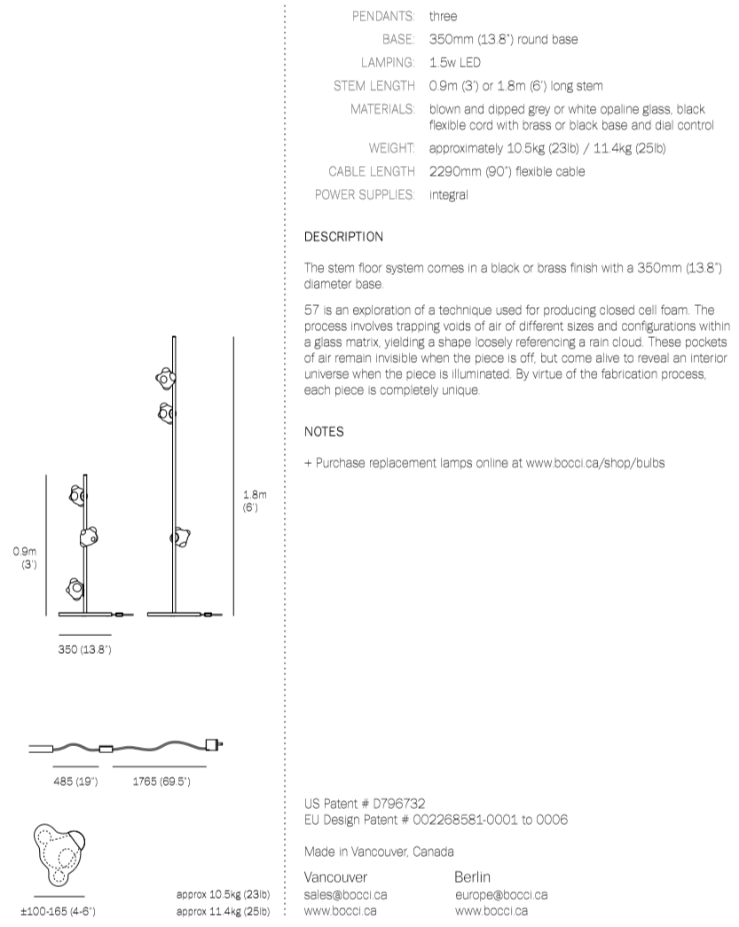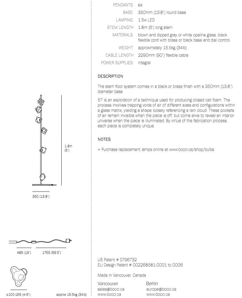 The 57 series stem floor system comes in a brass or black finish and three different configurations. The semi-rigid black fabric cord includes a patented integral 360 degree dimming system housed within a sleek brass cylinder.