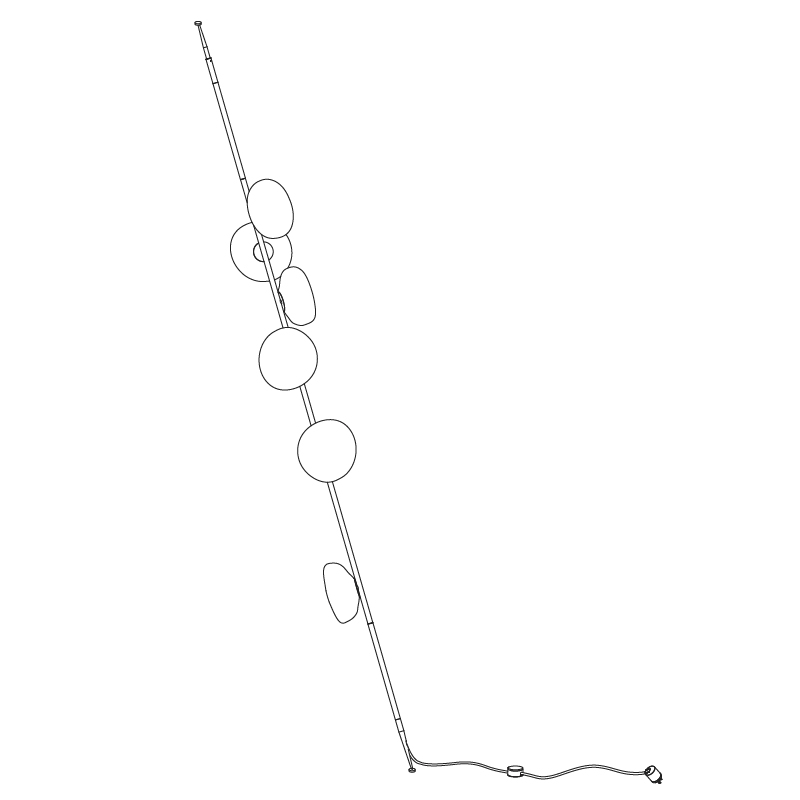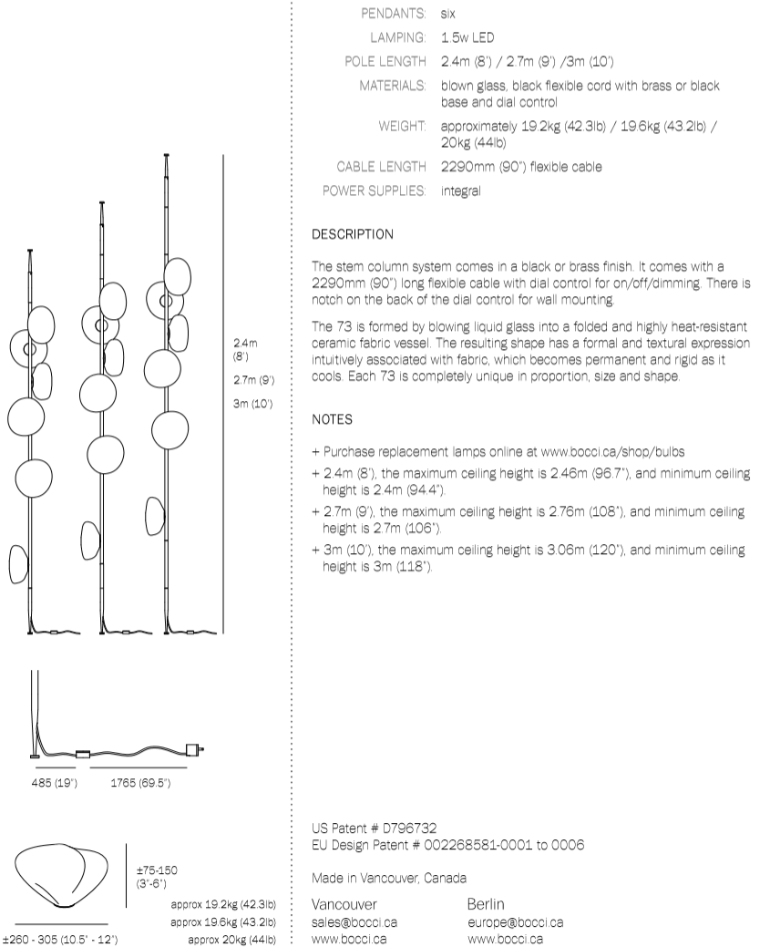 The 73 series stem column system comes in a brass or black finish, two different configurations and multiple height options. The spring loaded spike system allows for both vertical and angled installation. The semi-rigid black fabric cord includes a patented integral 360 degree dimming system housed within a sleek brass cylinder.