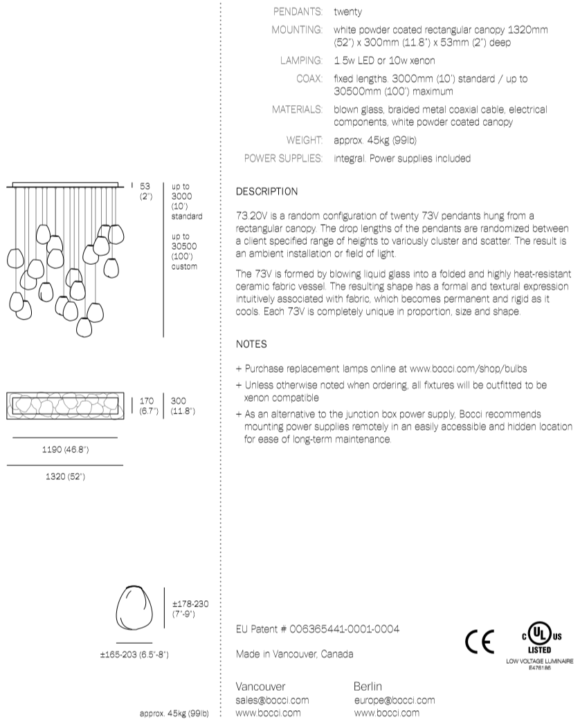 73.20V is a low voltage arrangement of 20 blown-glass pendants. Each pendant is hand blown into a folded and highly heat-resistant ceramic fabric vessel. Each pendant is housed with a 10 watt xenon or 1.5 watt LED lamp.