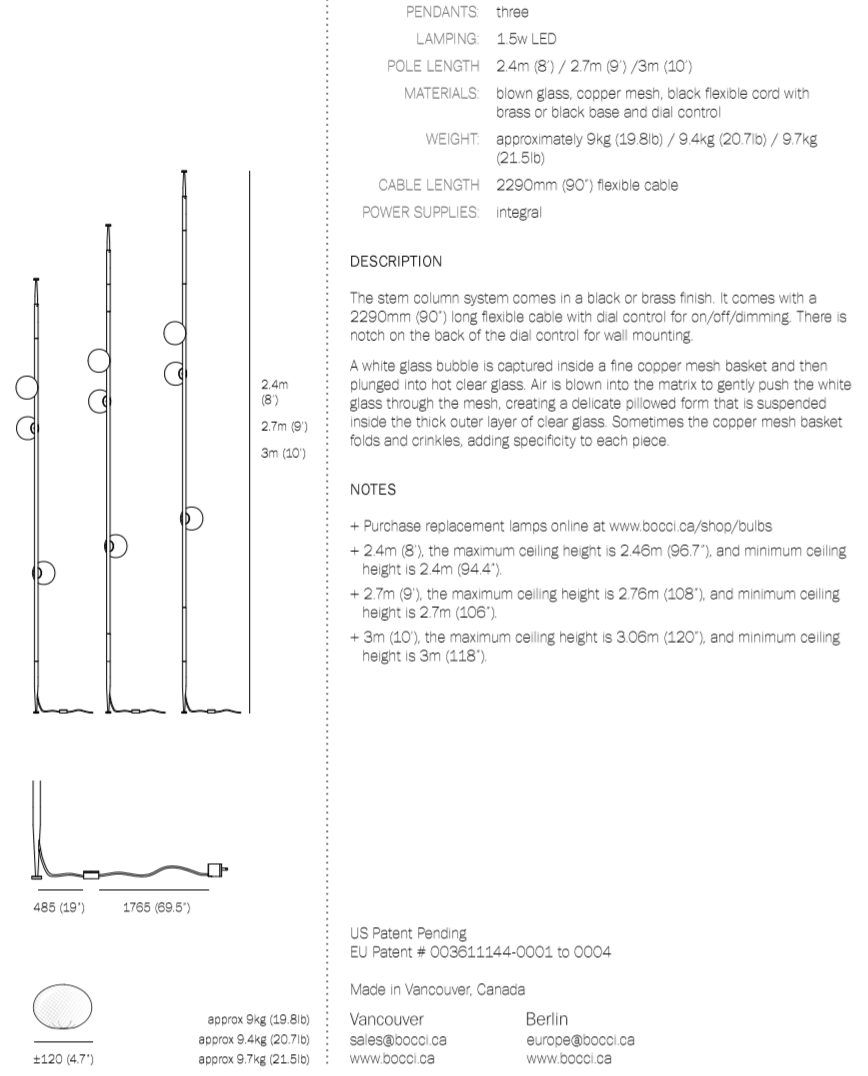 The 84 series stem column system comes in a brass or black finish, two different configurations and multiple height options. The spring loaded spike system allows for both vertical and angled installation. The semi-rigid black fabric cord includes a patented integral 360 degree dimming system housed within a sleek brass cylinder.
