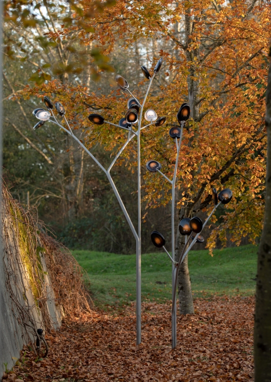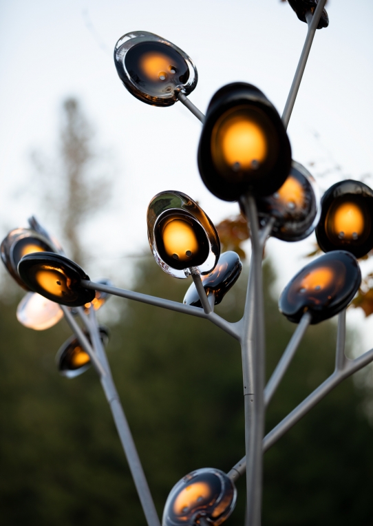 A bead blasted steel armature system connects the glass pieces to a series of branches and stems. Each armature segment carries low-voltage electricity and diverges into 2-4 separate branches, allowing an infinite variety of possible forms.