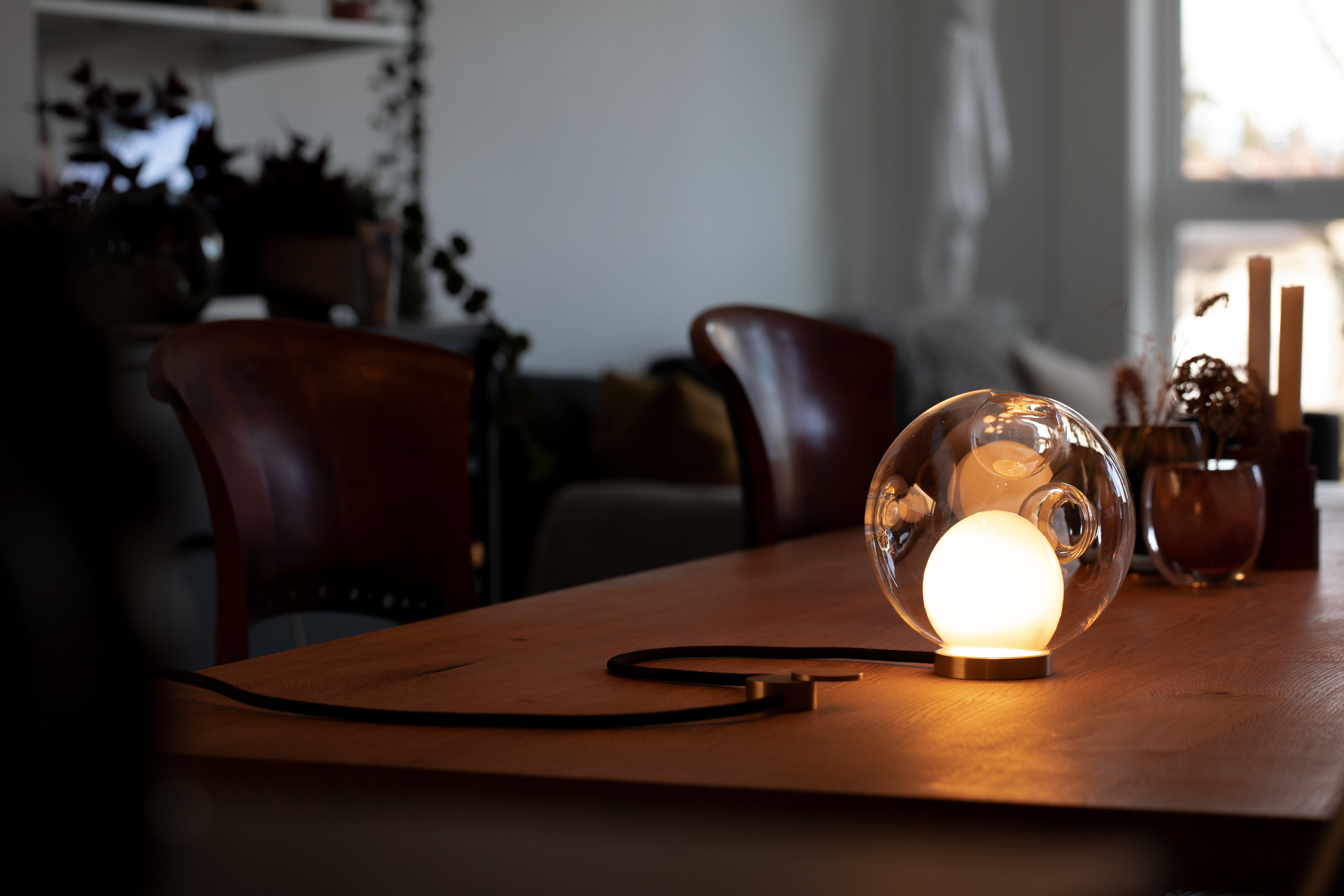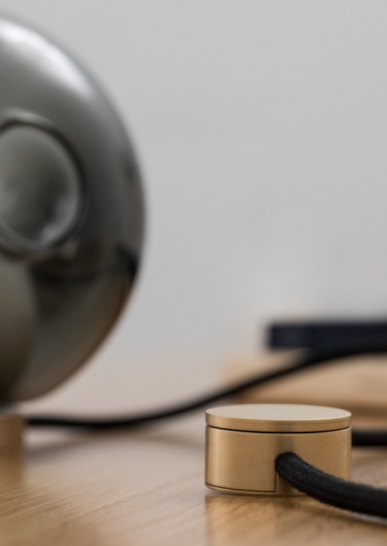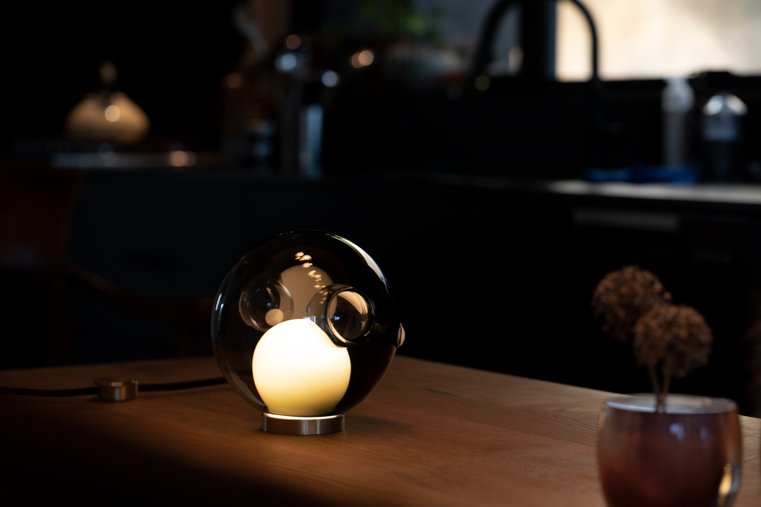 28 results from an innovative fabrication process that manipulates both the temperature and the direction of air flow into blown glass. The result is a slightly distorted sphere with an interior landscape of satellite shapes, including an opaque milk glass diffuser that houses a LED lamp.