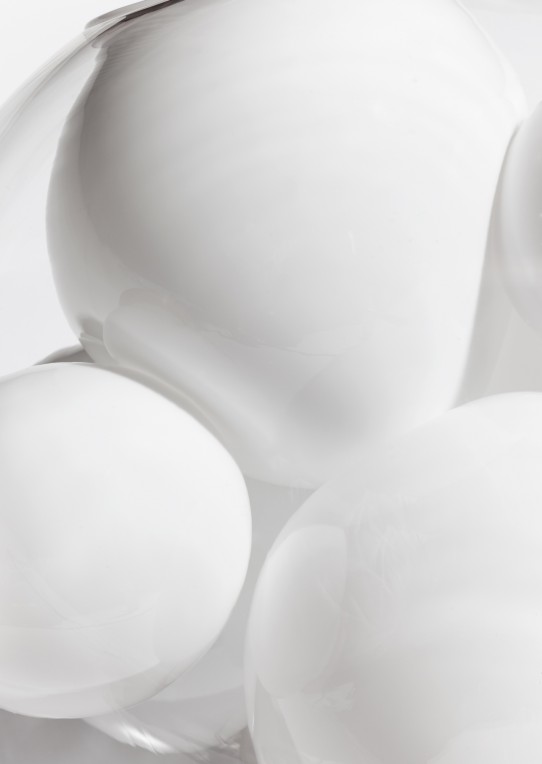 38V is a variant of the original 38 series where a large glass sphere is blown with a multitude of haphazard interior cavities, which intersect and collide in unpredictable ways. 38V is smaller, lighter and suspended with coaxial cables. The interior cavities can be filled with plants or left empty.