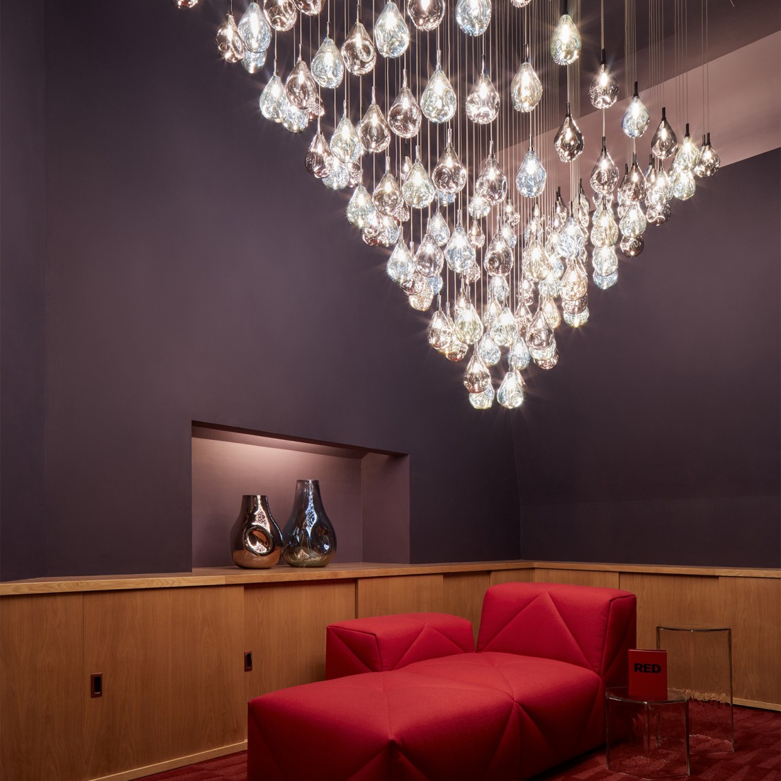 Varied colors, transparency and continuously changing shapes – the characteristic features of soap bubbles-- inspired this BOMMA collection. When lighted, the metallic sheen of its surface transforms to iridescent and translucent, exposing its crystal character. The entire collection is produced using the technique of hand-blowing without a form. The seemingly perfect droplet of molten glass is given a unique shape as well as a unique color spectrum. The Soap Mini collection allows unlimited space for your creativity, with the option to create as large groups of crystal drops as you fancy – from smaller compositions to expansive light constellations.