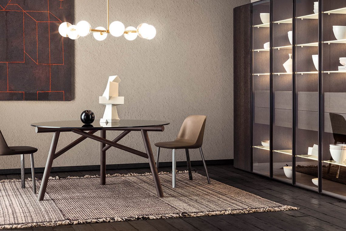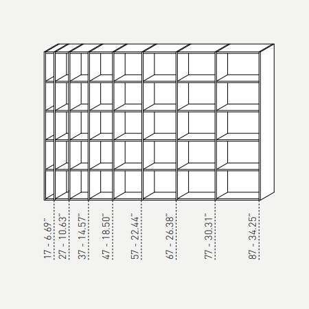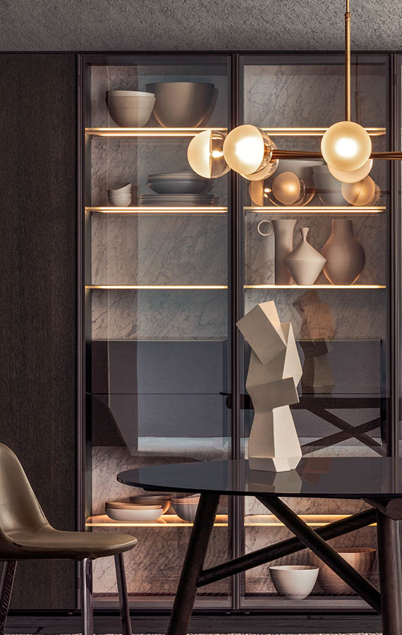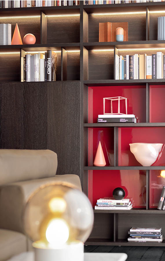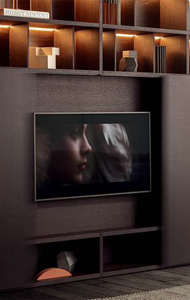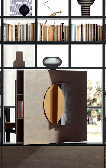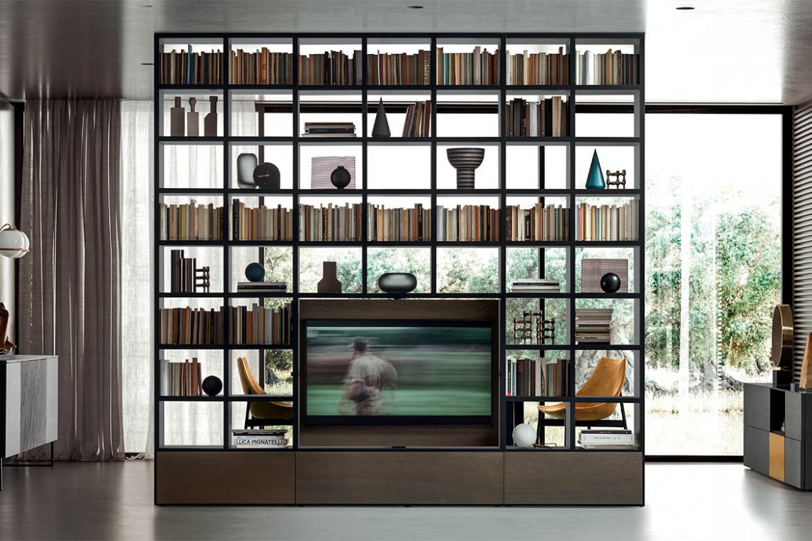 Arranging a customised space for everything, creating distinctive combinations and balancing open and closed spaces: Spazioteca is the synergy of order, rhythm and proportion. The classic bookcase concept opens up to new versatile possibilities, providing a place to store objects, books and a TV screen, dividing areas of the home and integrating home office solutions. It is the first modular system with side panels, shelves, back panels and dividers with 1 cm pace as standard, and compartments with no visible holes or hardware. Every composition has the same dynamic, lightweight design, custom-made to meet every need.