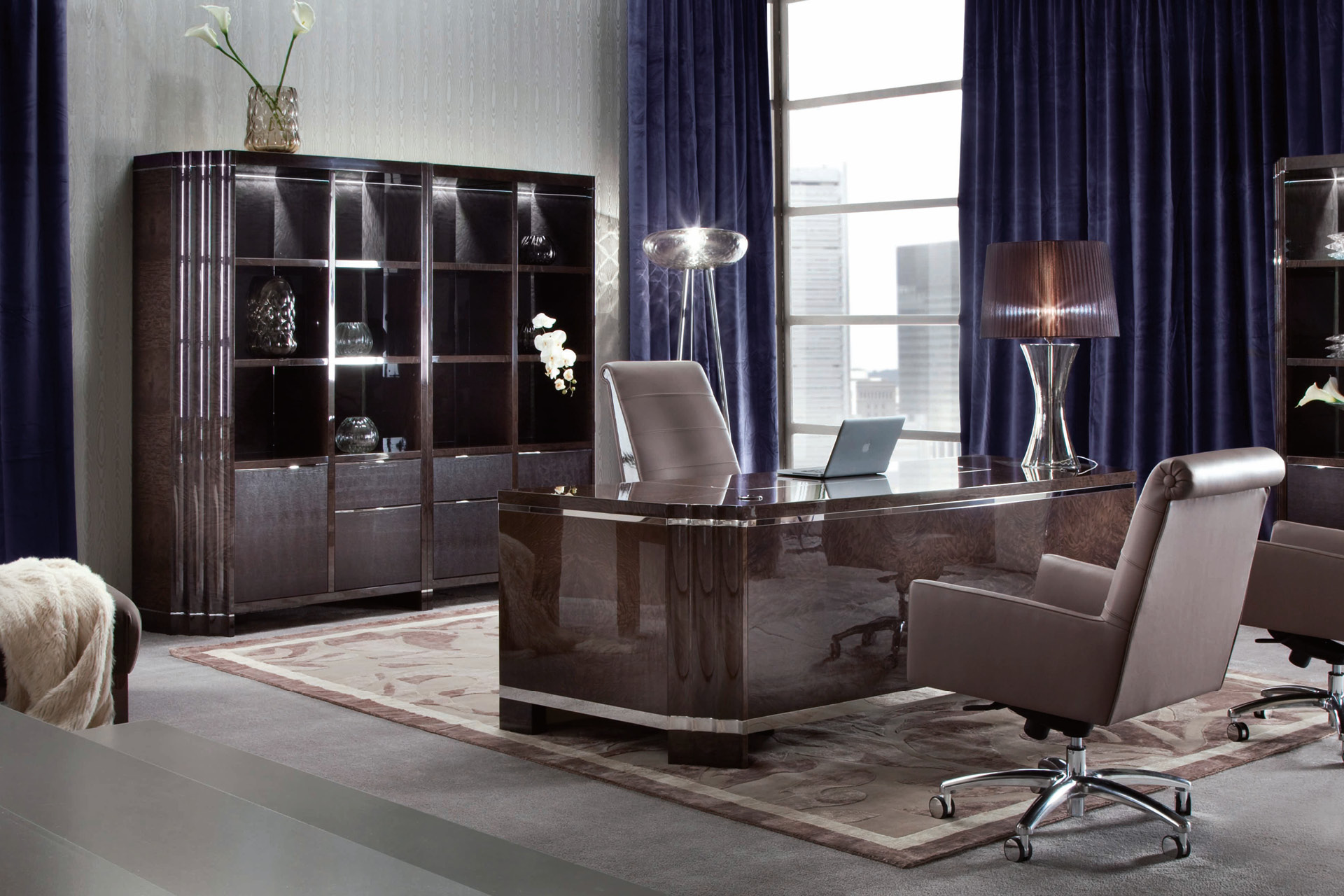 Double Bookcase finished in moka japanese tamos burl veneer in high gloss polyester. 8 wooden shelves and special led light sytem including touching switch. 2 doors, 2 small drawers and 2 file drawers covered with "Moresco" leather.