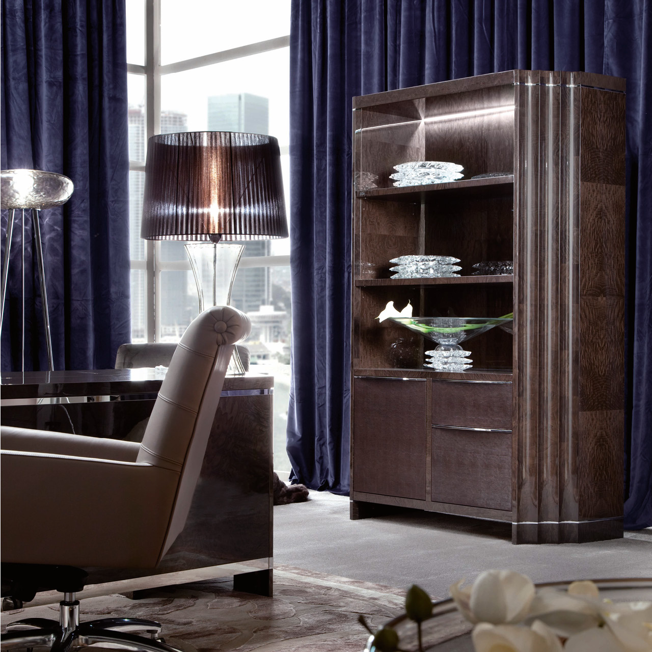 Single Bookcase finished in moka japanese tamos burl veneer in high gloss polyester. 2 wooden shelves and special led light sytem including touching switch.1 door, 1 small drawer and 1 file drawer covered with "Moresco" leather.