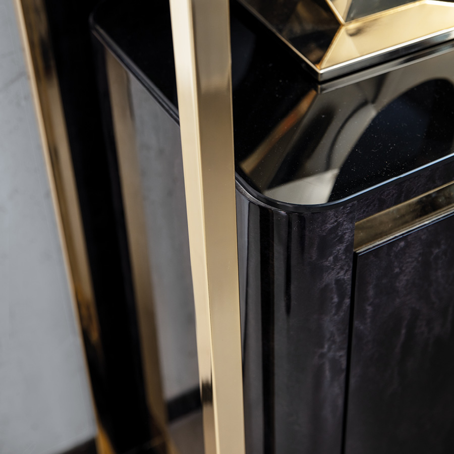 Bookcase in Black Bubinga burl veneer with high gloss polyester finish. Wooden back,2 doors with 2 glass adjustable shelves. Top part with led light. Structure, base and handles in light gold chrome stainless steel. 5 smoked tempered glass shelves.