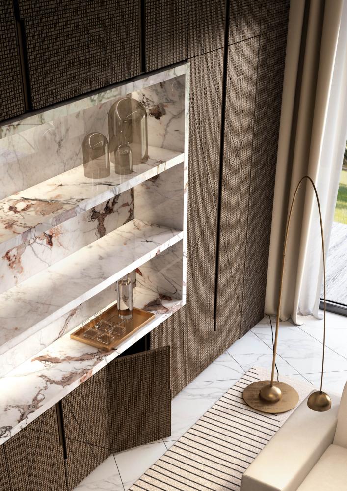 The Maxima day wardrobe systems are available in different finishes, such as the "Liquid Metal" finish, with various accessory options and integrated doors and wall panels, to create infinite compositions and allow complete customization.
