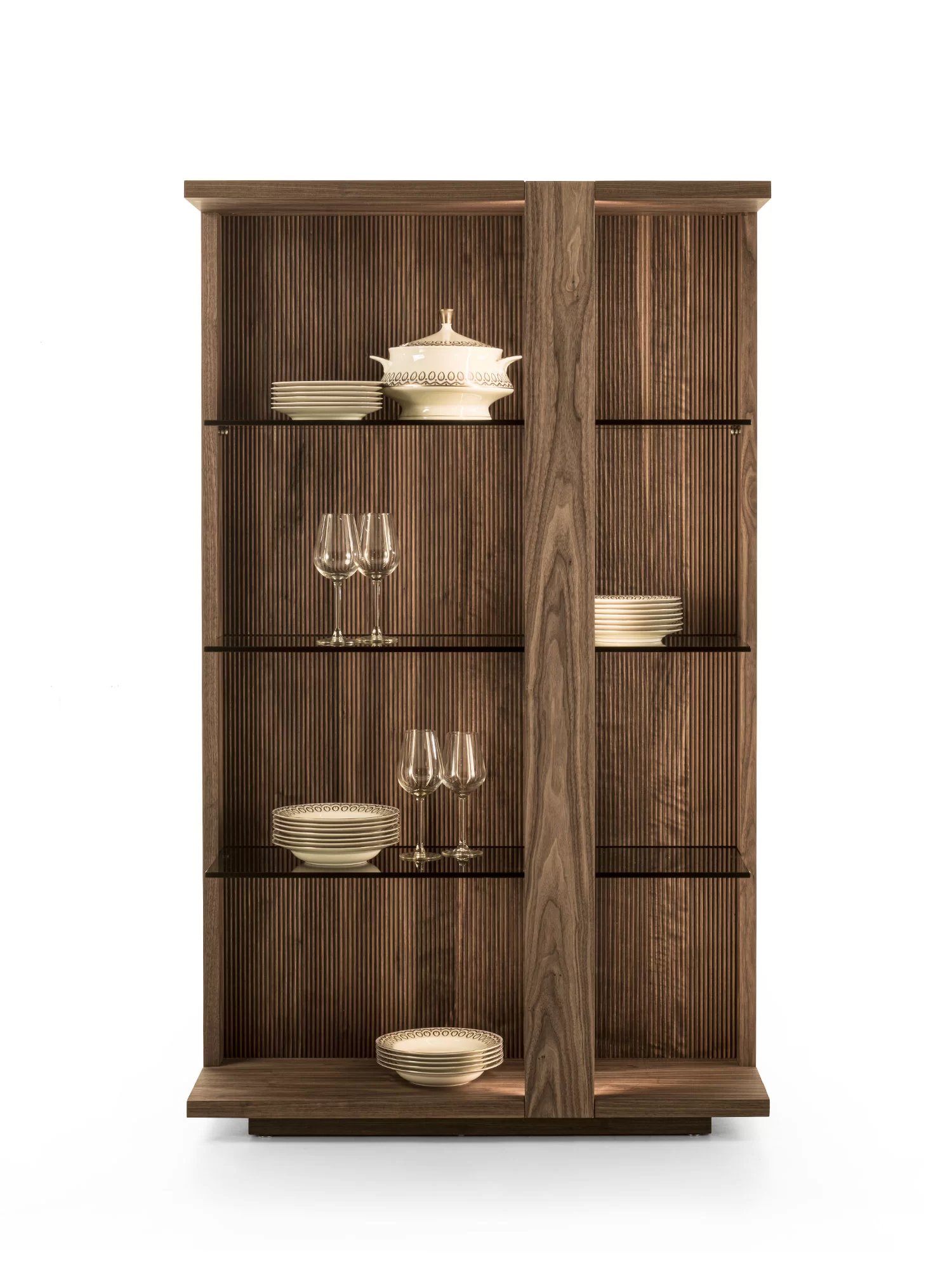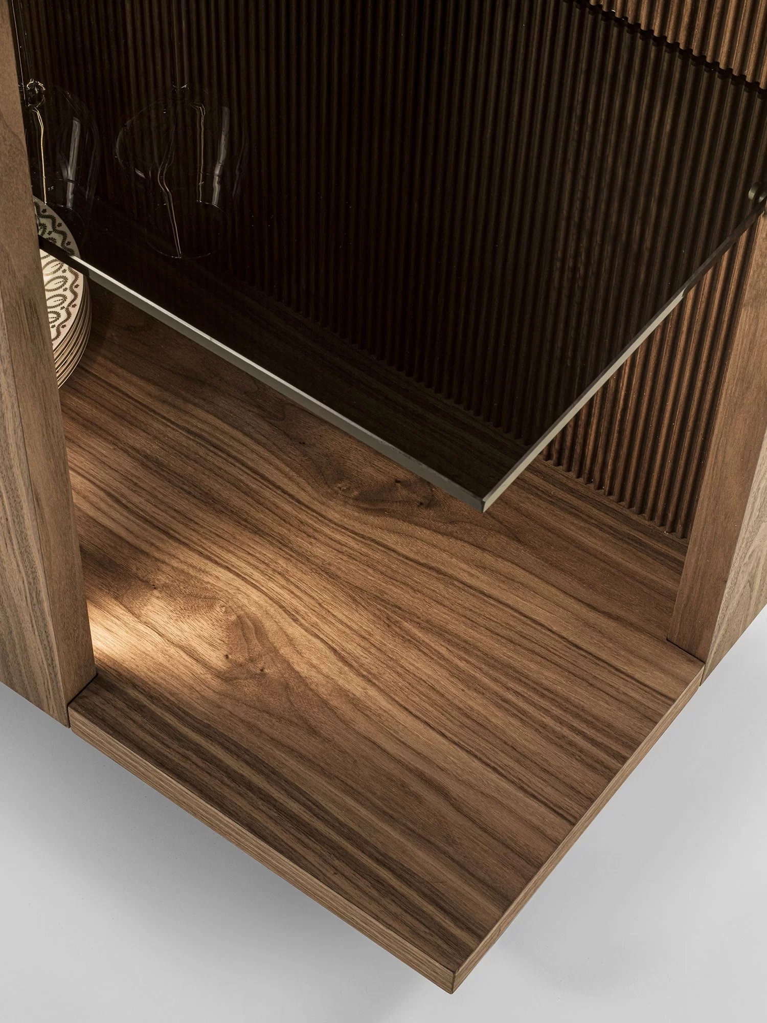 La collezione Revo viene completata da una credenza alta, a giorno, in legno massello e listellare, dotata di tre ripiani in vetro sp.10mm. Top e base in legno. Disponibile in due versioni: con schienale caratterizzato da una particolare lavorazione verticale, Fresart, che crea un effetto geometrico moderno e dinamico oppure con decorazione Fresart applicata sulle tre fascie verticale perimetrali strutturali. Illuminata con sistema di luci LED con accensione tramite telecomando.