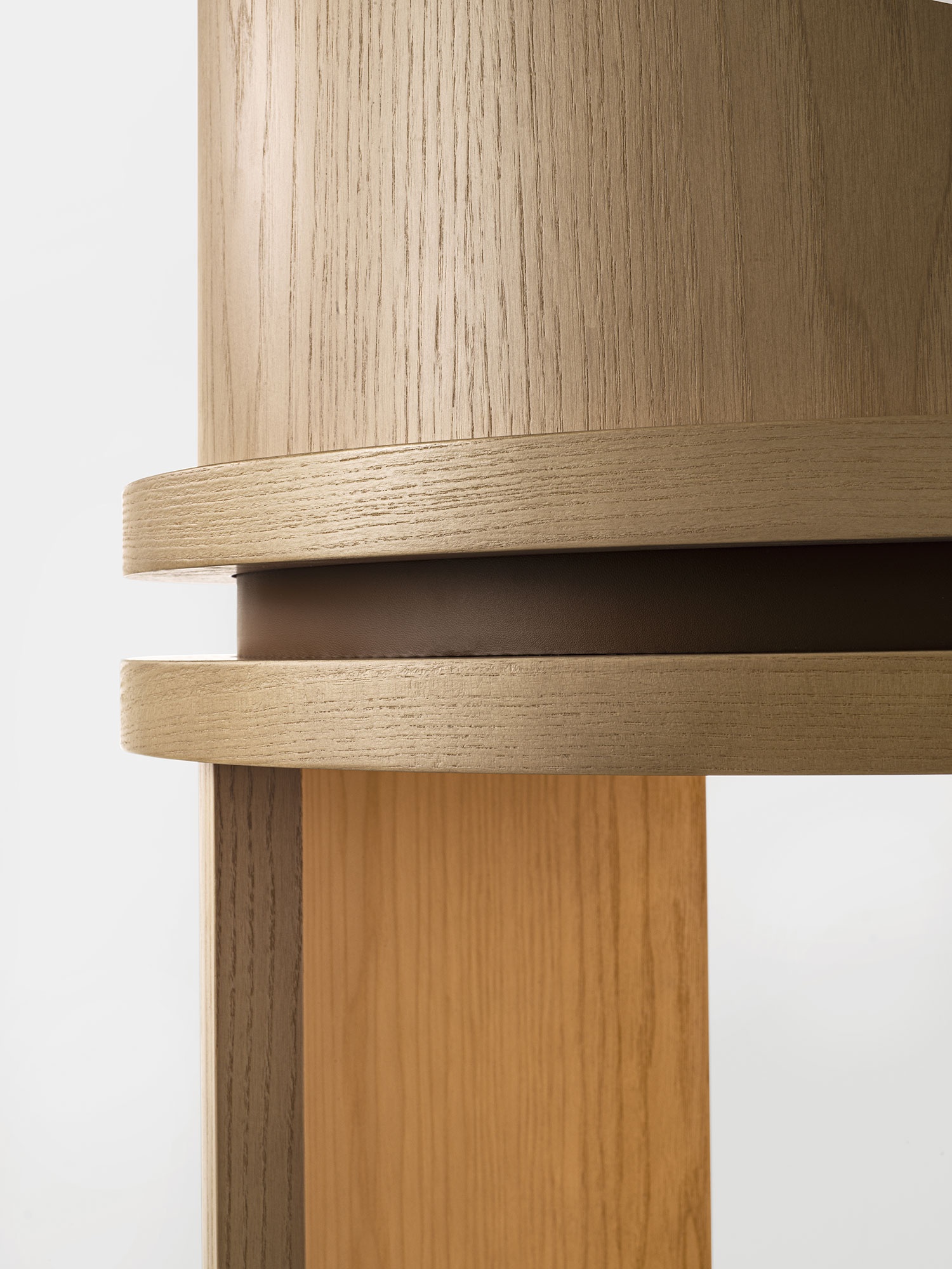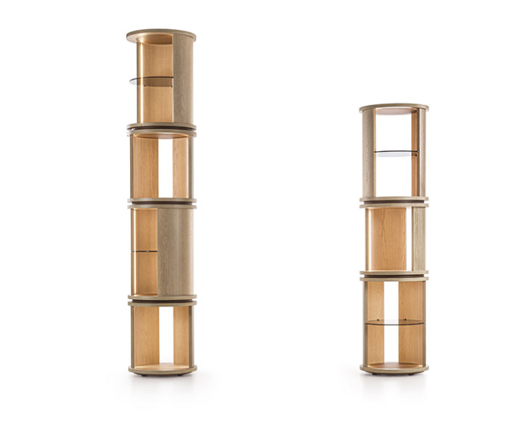 La libreria Roma entra a far parte della collezione Vittoria Frigerio grazie alla sua sofisticata microarchitettura basata sulla forma cilindrica che esalta le forme. Si caratterizza da una struttura in legno con inserti in cuoio. La struttura in legno, su cui possono poggiare dei ripiani in vetro, esalta una purezza formale che ricorda gli antichi totem rivisitati in versione moderna per un nuovo approccio decorativo per un elemento libreria. Bellezza immutata per un arredo senza tempo.