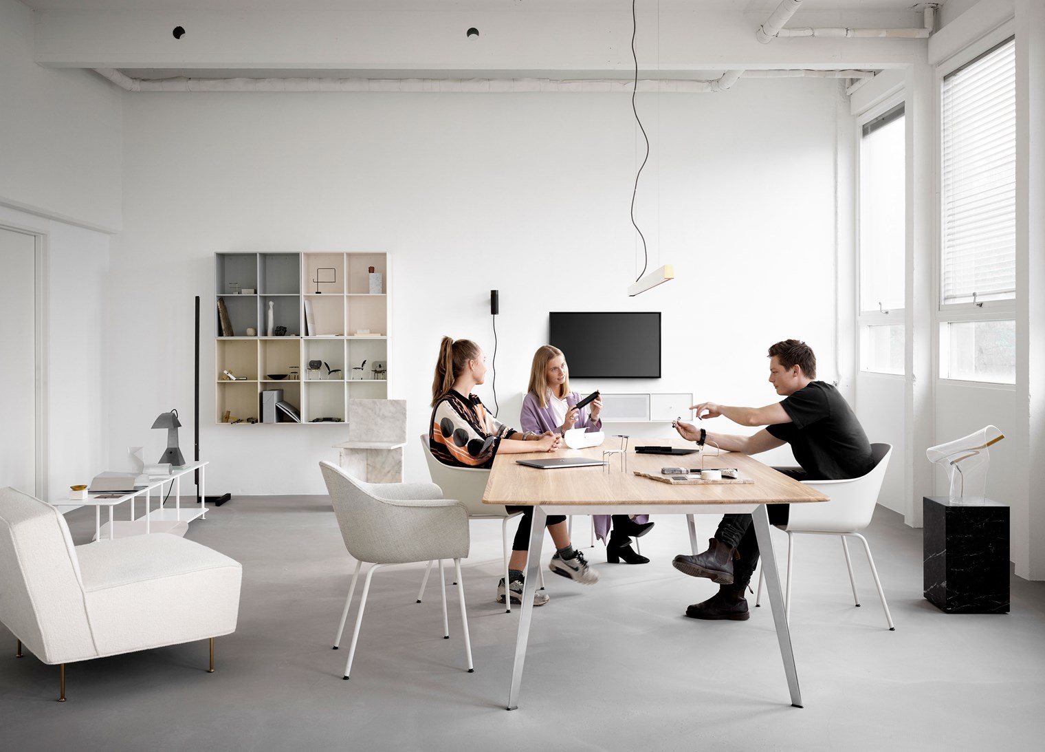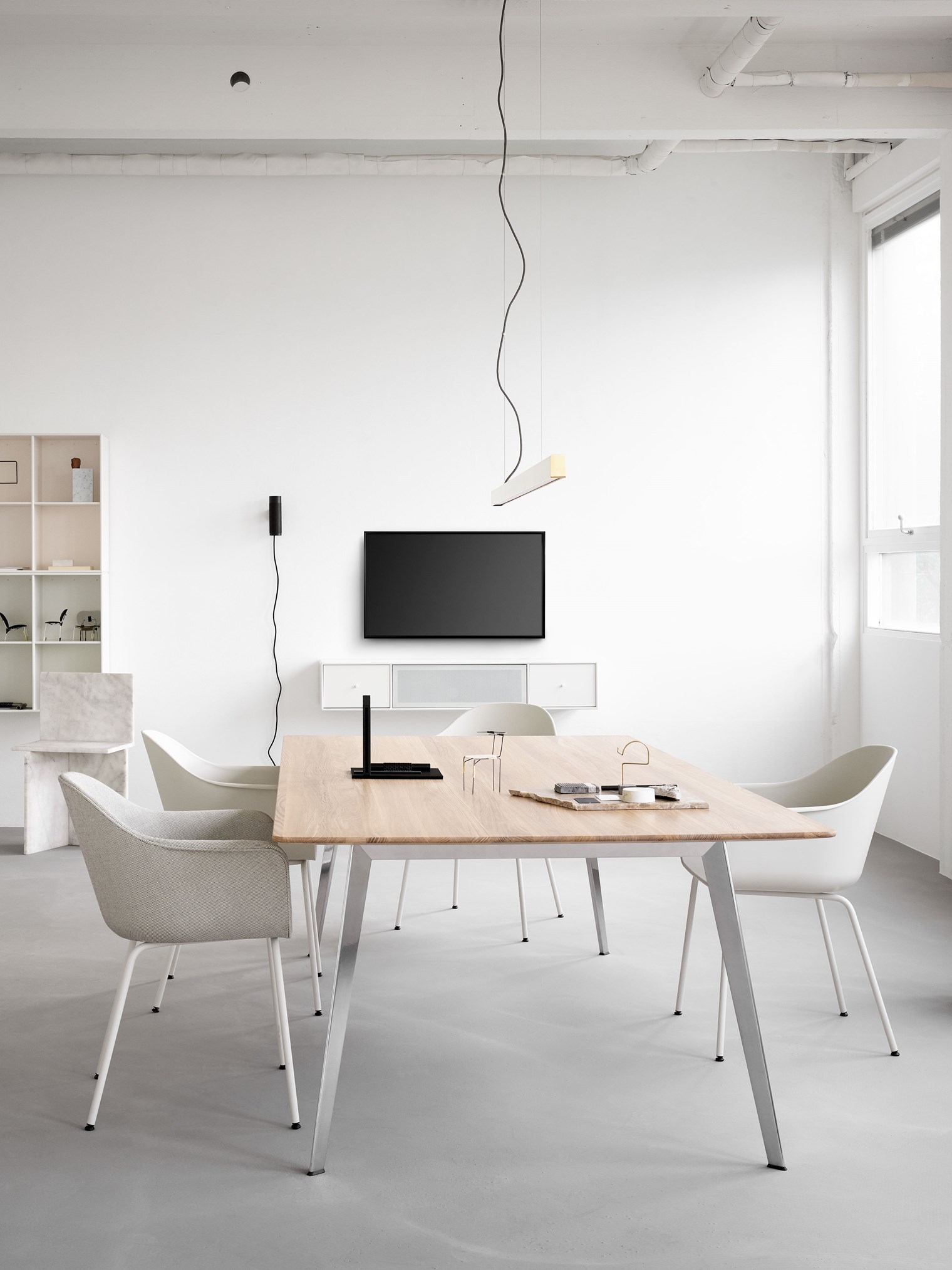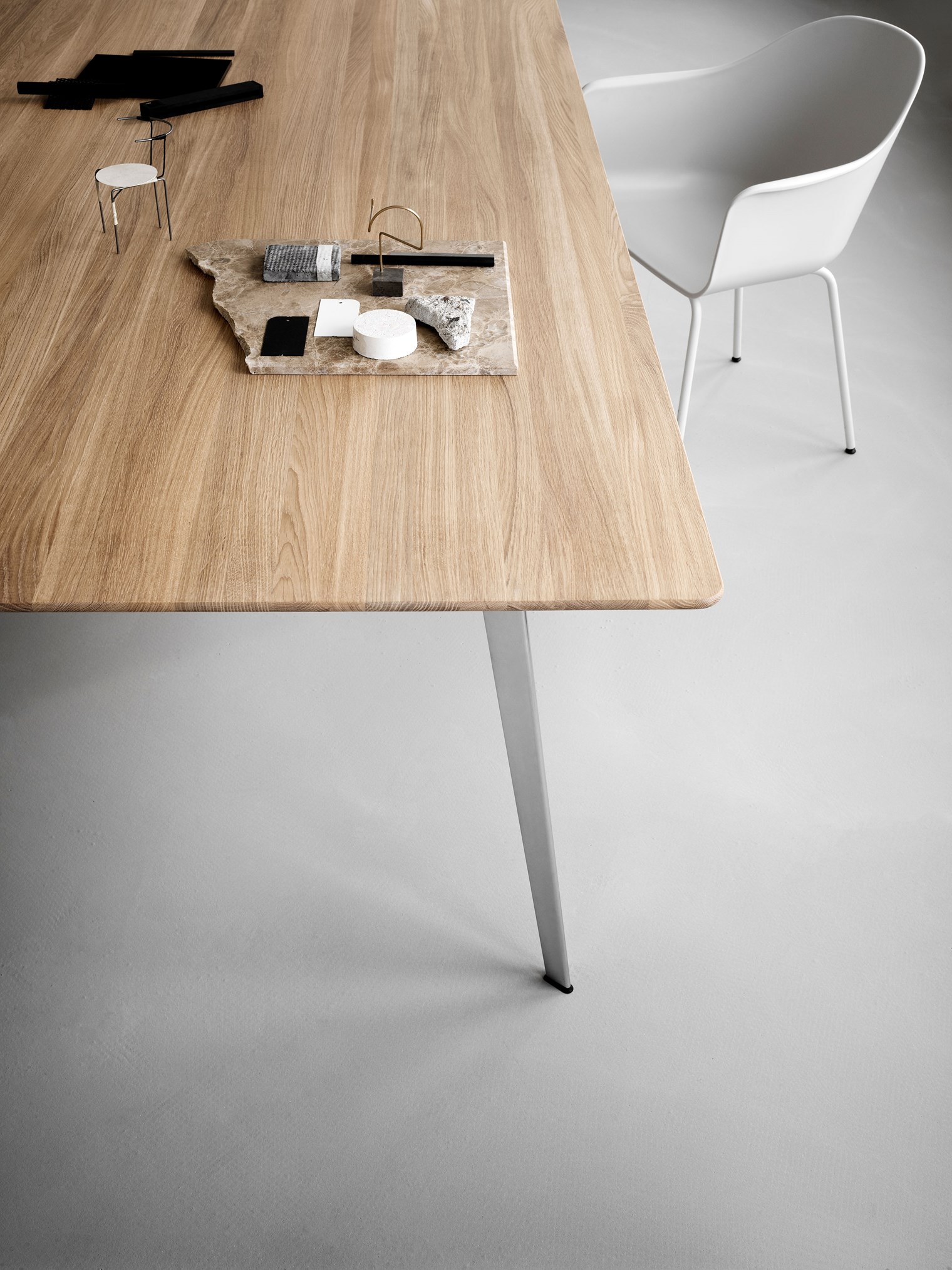 桌子視覺上顯得輕盈干凈,結構堅固穩定。桌腿略微向外傾斜,以提供不受限制的腿部空間,并且框架隱藏在桌面下方。該系列有多種尺寸可供選擇,可靈活適應任何家庭和辦公環境。該桌子的桌面共有八種不同的材料:雪絲層壓板、黑色和新北歐顏色的油氈、白橡木、燒橡木和黑橡木以及實心道格拉斯橡木和實心橡木貼面。
