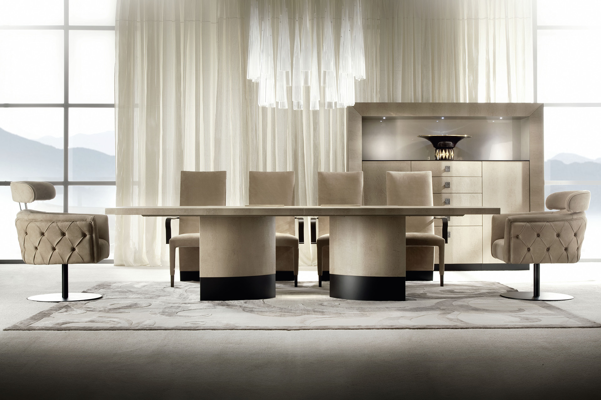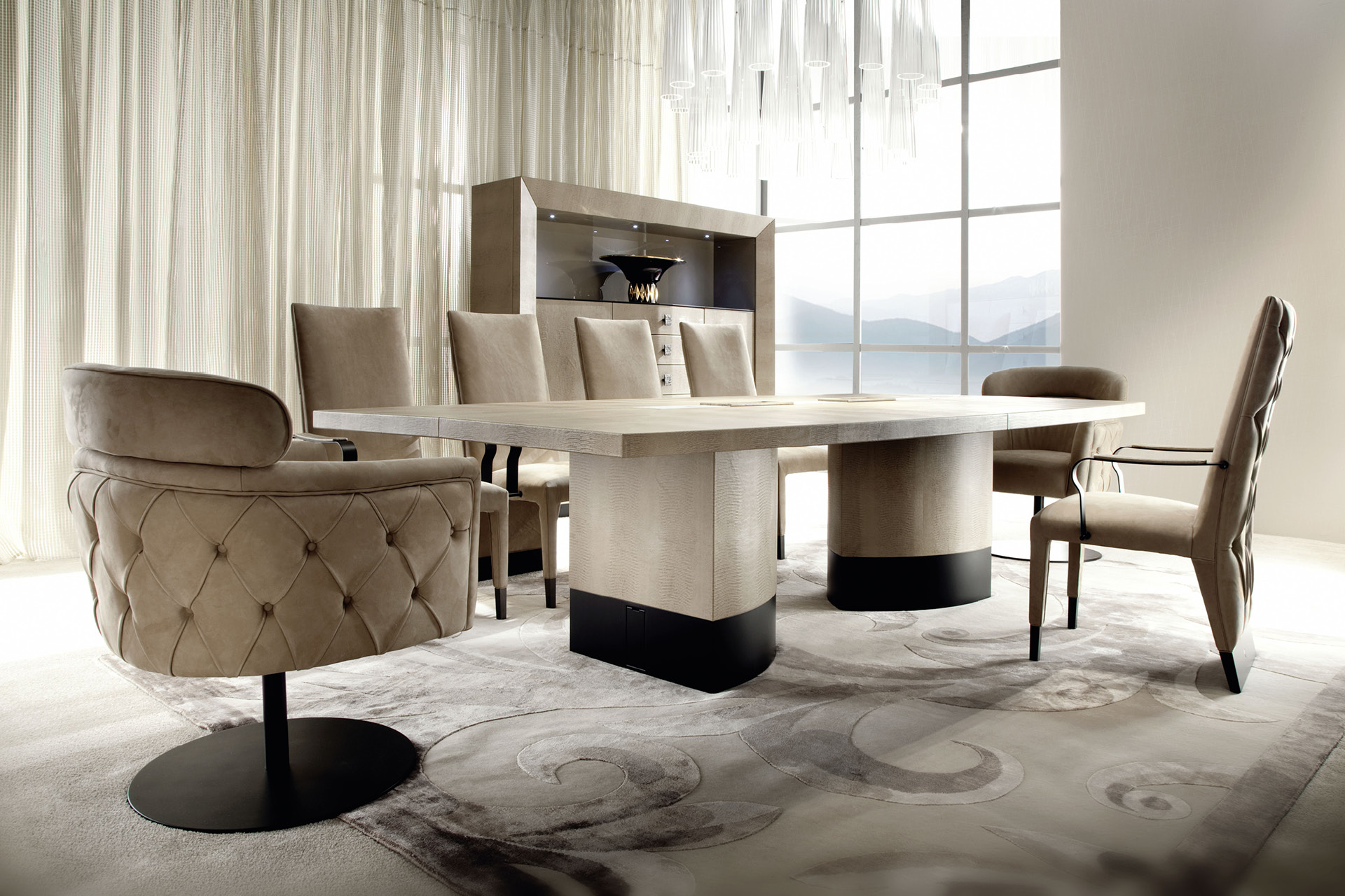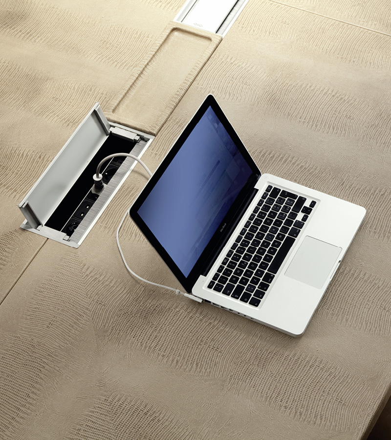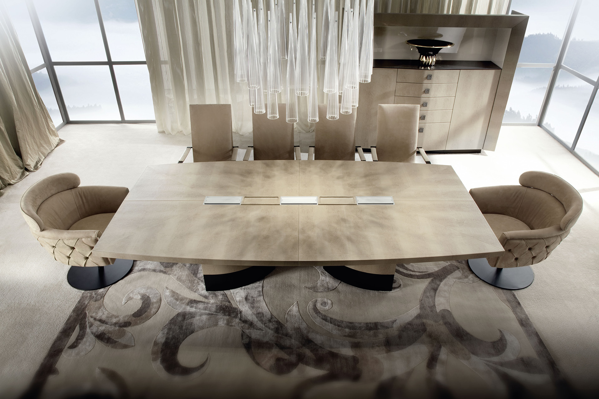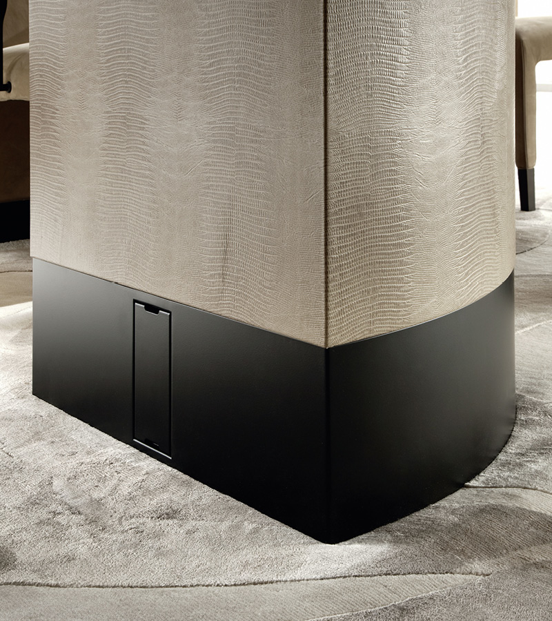 Conference table in armadillo printed leather with base in bronzed brass. 3 metal wirings boxes included into the center top.