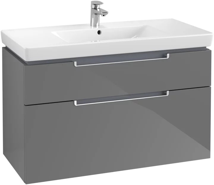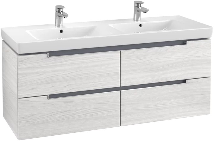 Modern, angular bathroom furniture with sophisticated integrated handles