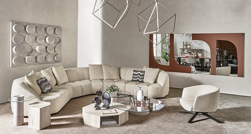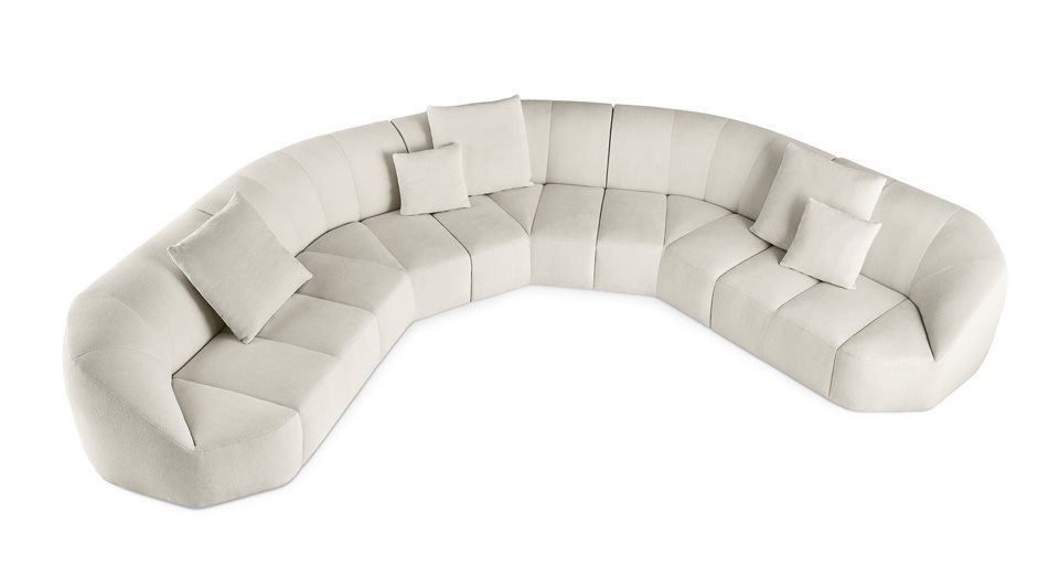 Divano modulare in poliuretano espanso indeformabile a densità differenziate e fibra poliestere con struttura interna in legno. Piedi in legno laccato nero. Disponibile con rivestimento in tessuto o pelle nei colori di campionario. Cuscini decorativi in fibra poliestere, su richiesta. Non sfoderabile. Moduli non vendibili singolarmente.