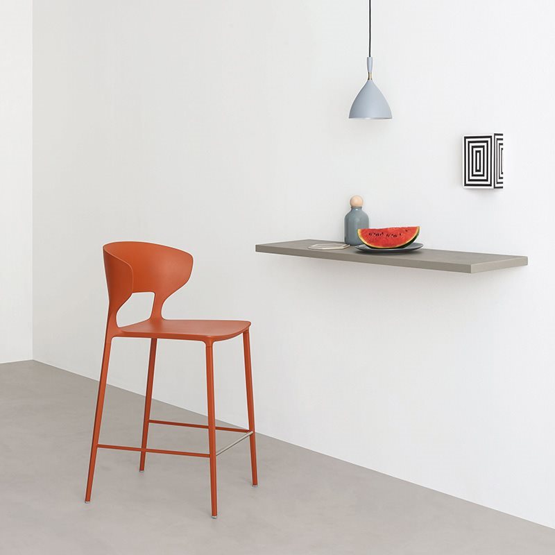 The contract world enters the domestic space with the Koki range of chairs and stools with a contemporary, fresh design. A perfect balance of form, function and innovation, fascinating from any prespective. Following on from the chair of the same name, the Koki stool adds a new element to the range's versatile character.Stacking chair with self-standing body in integral polyurethane, containing a steel frame. Mould-coating available in the different embossed colours as per sample collection. Steel legs in tubular conic shape, square section, lacquered in the same colours as the frame. Also suitable for outdoor.