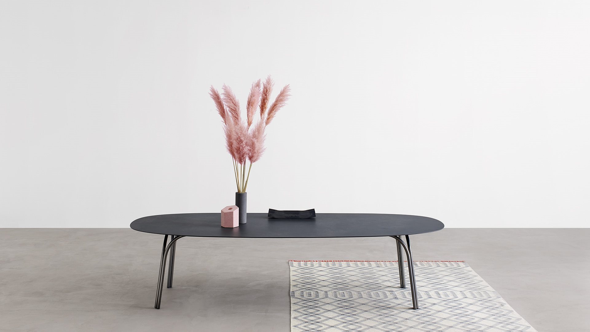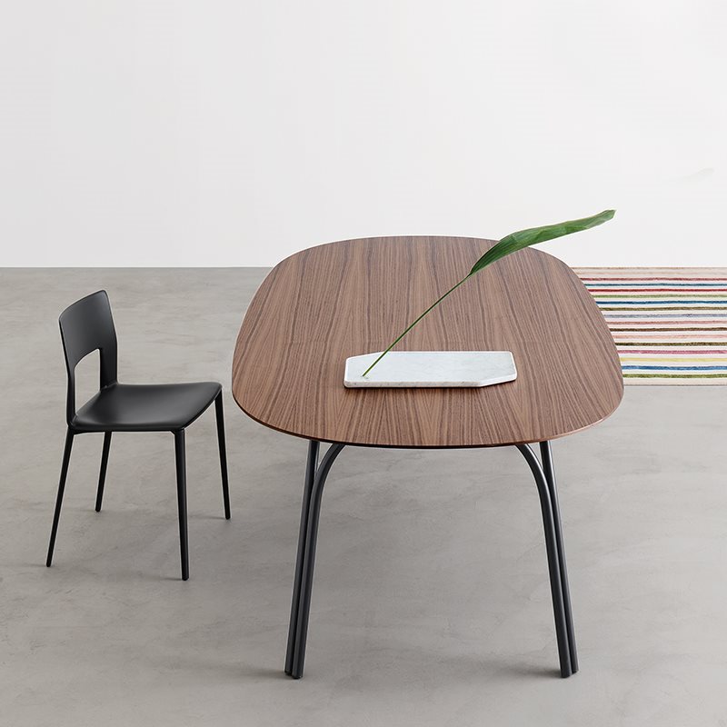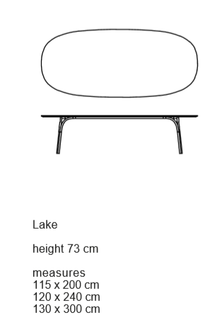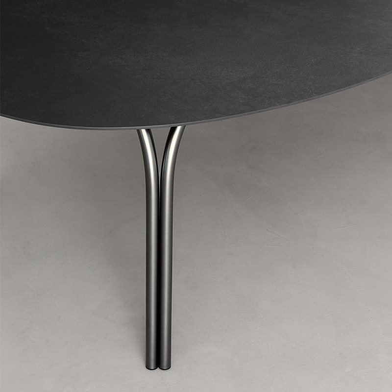 Lake has a disarming design thanks to its unconventional simplicity for contemporary everyday life.Table with steel tubes ?30 mm, oval top in ceramic or walnut Canaletto veneered with MDF under-top support lacquered in matching colour.At first glance, it looks like the still surface of an artificial lake: an asphalt colour mirror, placed into domestic or public settings.