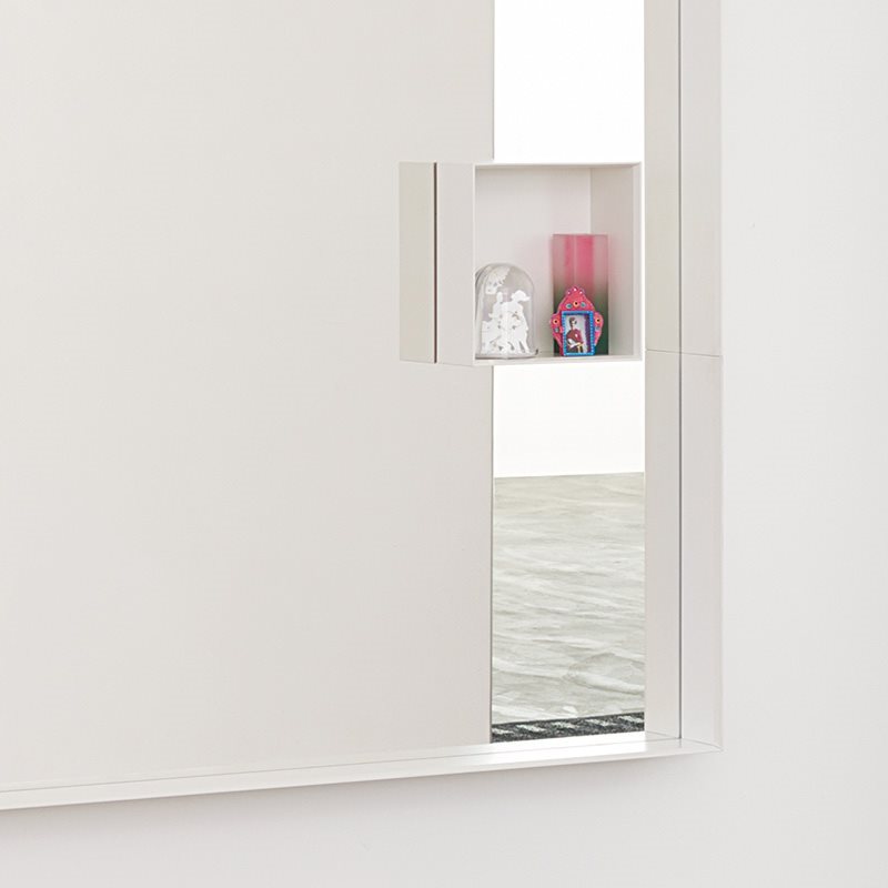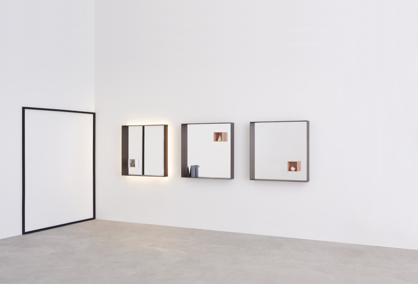 A formal frame: this is a mirror which combines a visual aspect, created by the balance between the flat mirror and the empty volume of the coloured box, and a functional one created by the mirror's frame which doubles as a shelf.