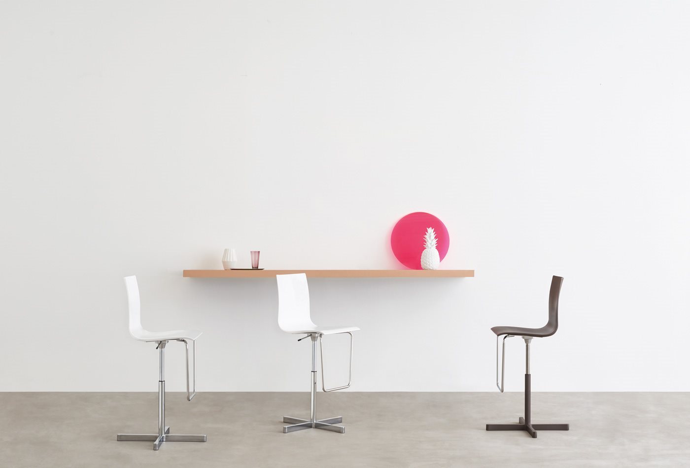 Wok, a stool range with three different frame structures, a chair made of acrylic or upholstered in cowhide, cuoietto, leather or eco- leather, a height-adjustable swivel stool: a wide range to meet all needs in the residential sector or contract world.