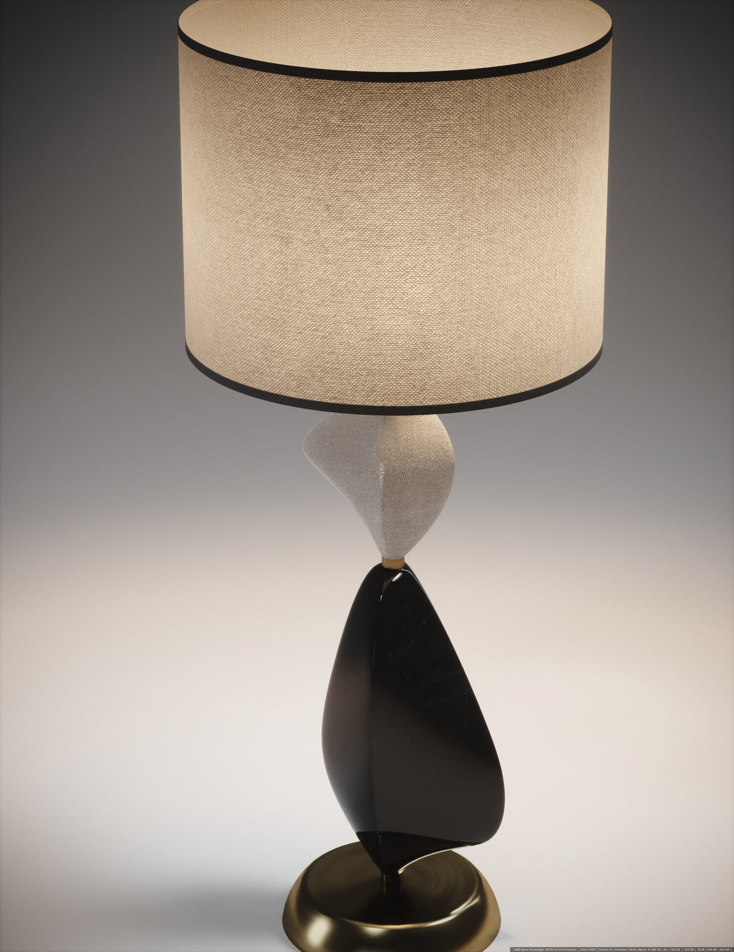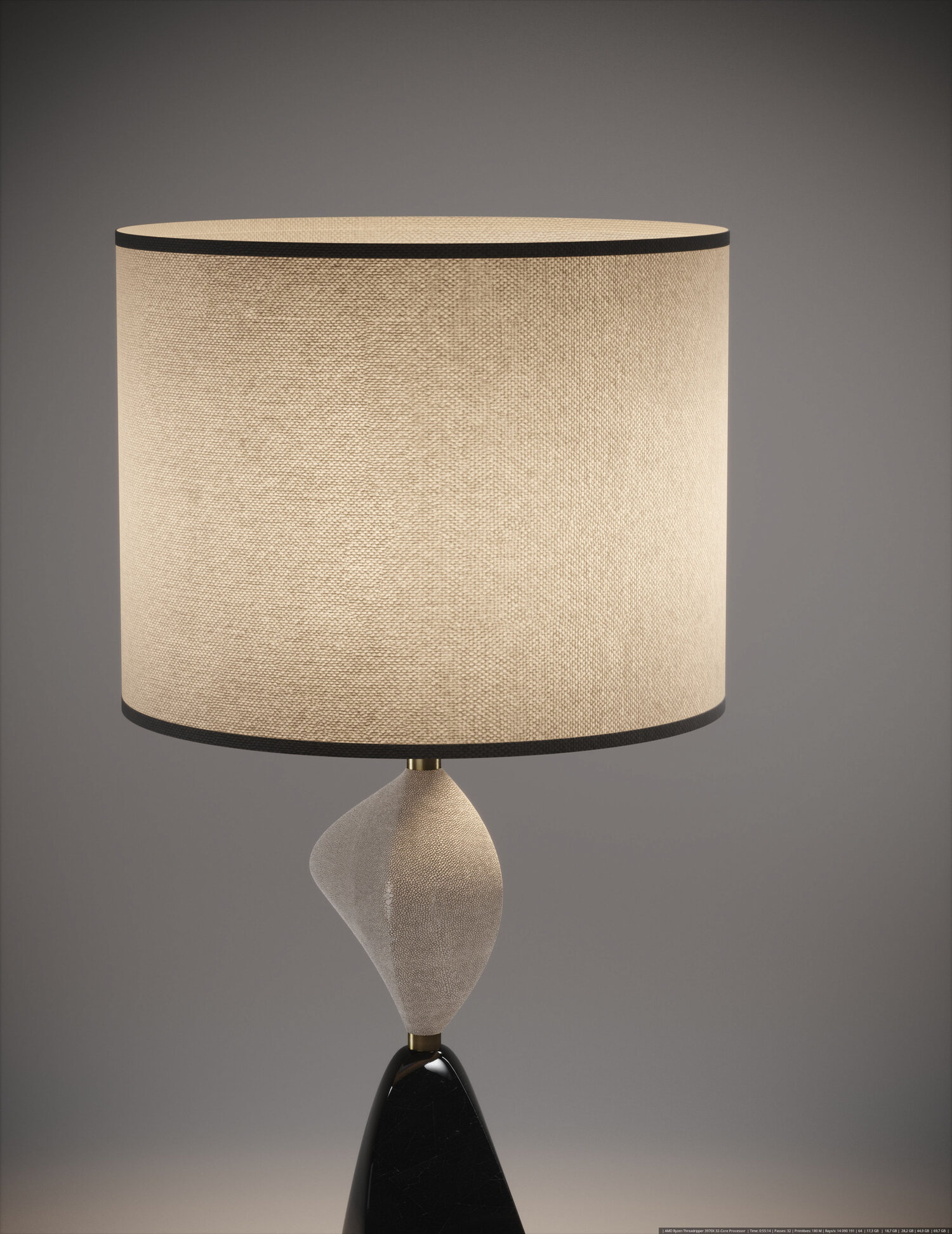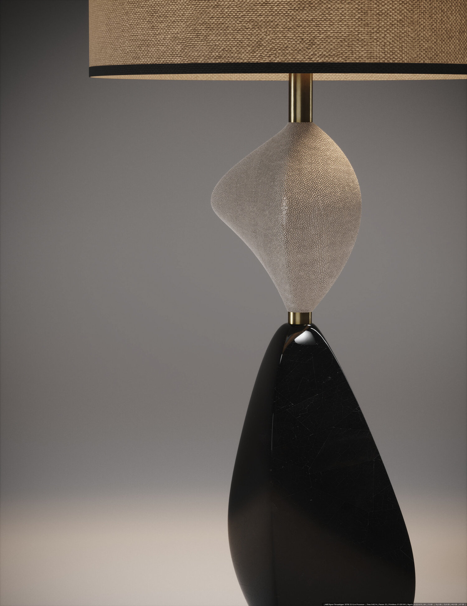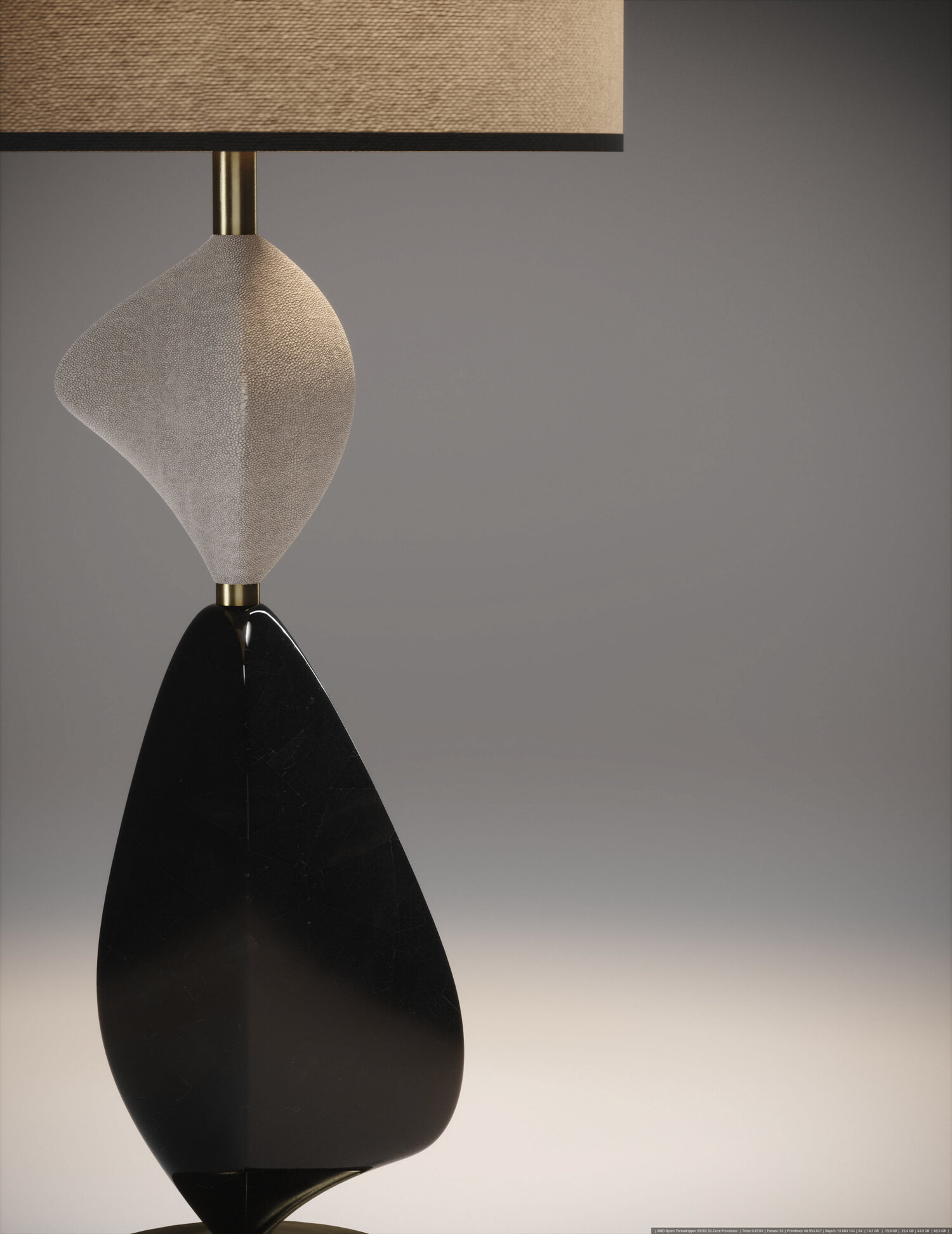 The Cosmo III table lamp by Kifu Paris is a whimsical and sculptural piece, inlaid in cream shagreen and black pen shell with bronze-patina brass accents. This piece is a sister to the original Cosmo Lamp by Kifu Paris. The amorphous shapes on the bottom part can be moved to adjust the angle of each part. This piece is a part of the Cosmo Capsule, see images at end of slide. This piece is designed by Kifu Augousti, the daughter of Ria and Yiouri Augousti.