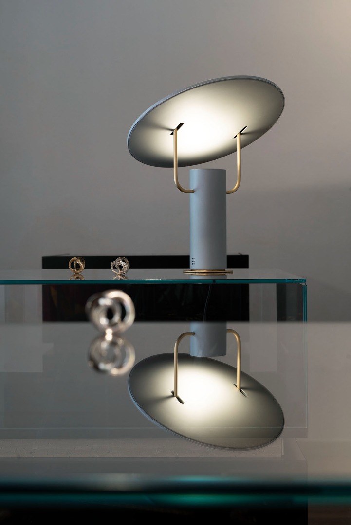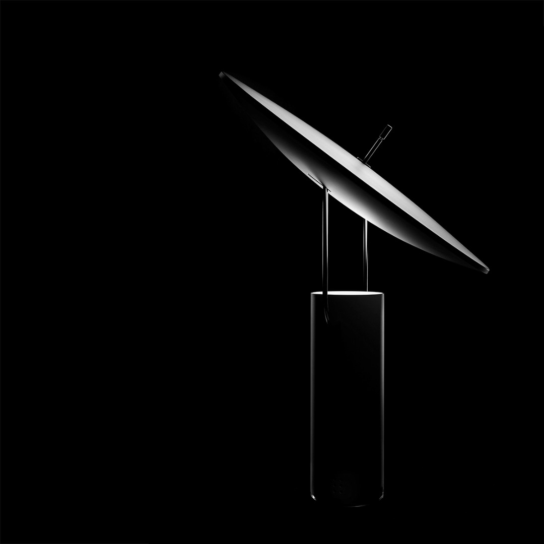 An allusion to satellite dishes and to space. A white or multi-colored light reflects on the adjustable curved surface supported by two light chromed arms and lights in a diffused way with games of light and shadow on the environment surrounding you.