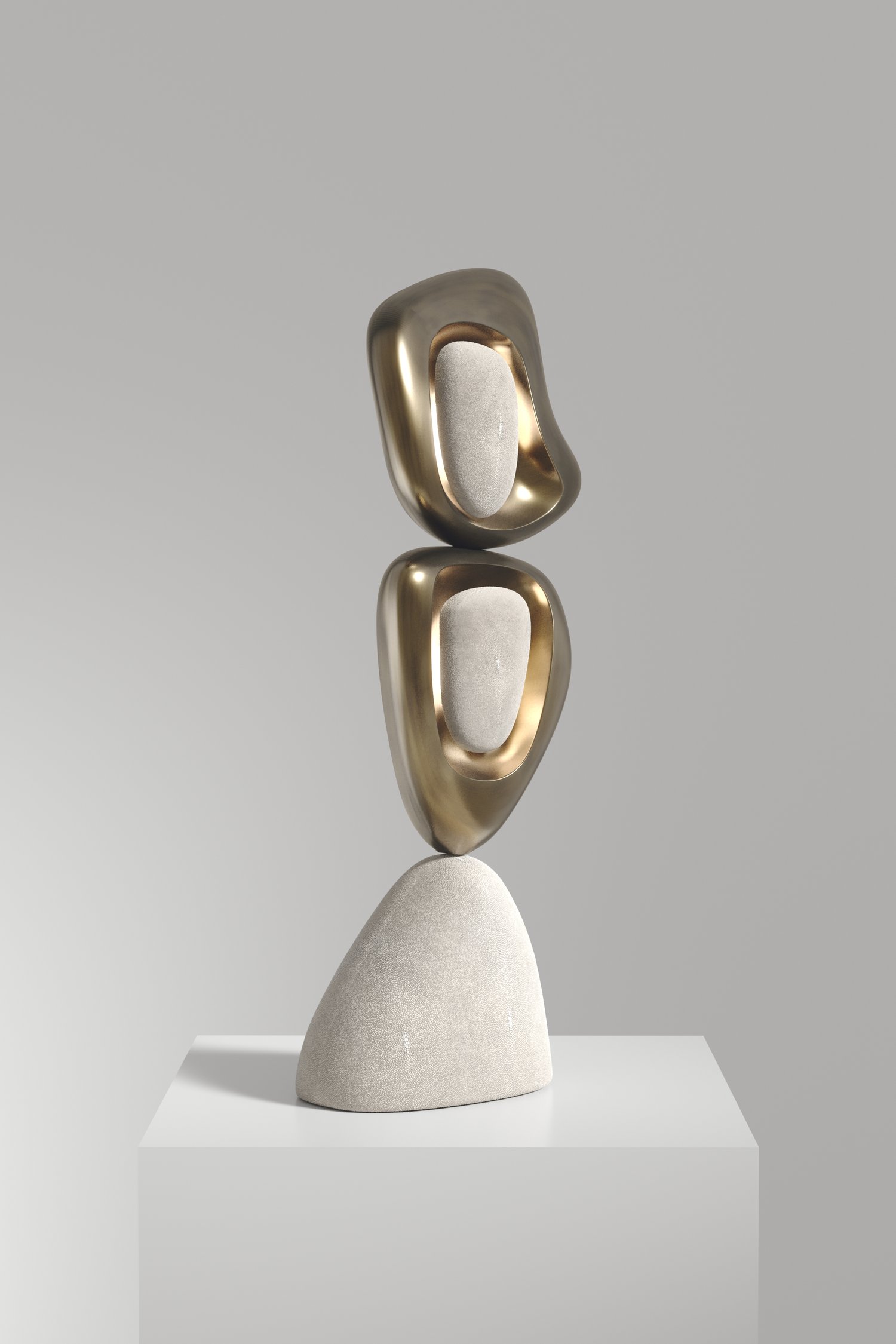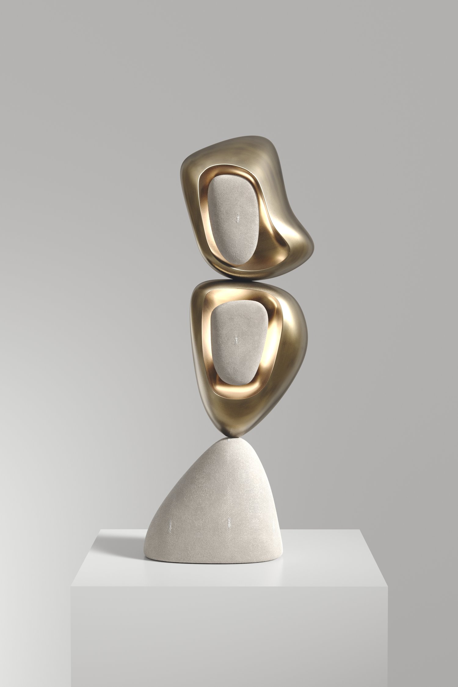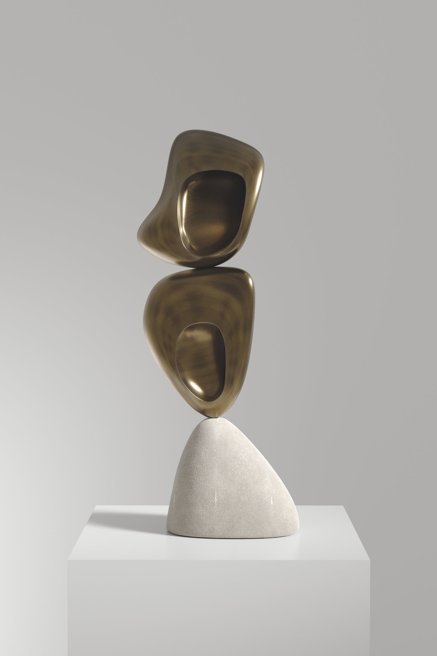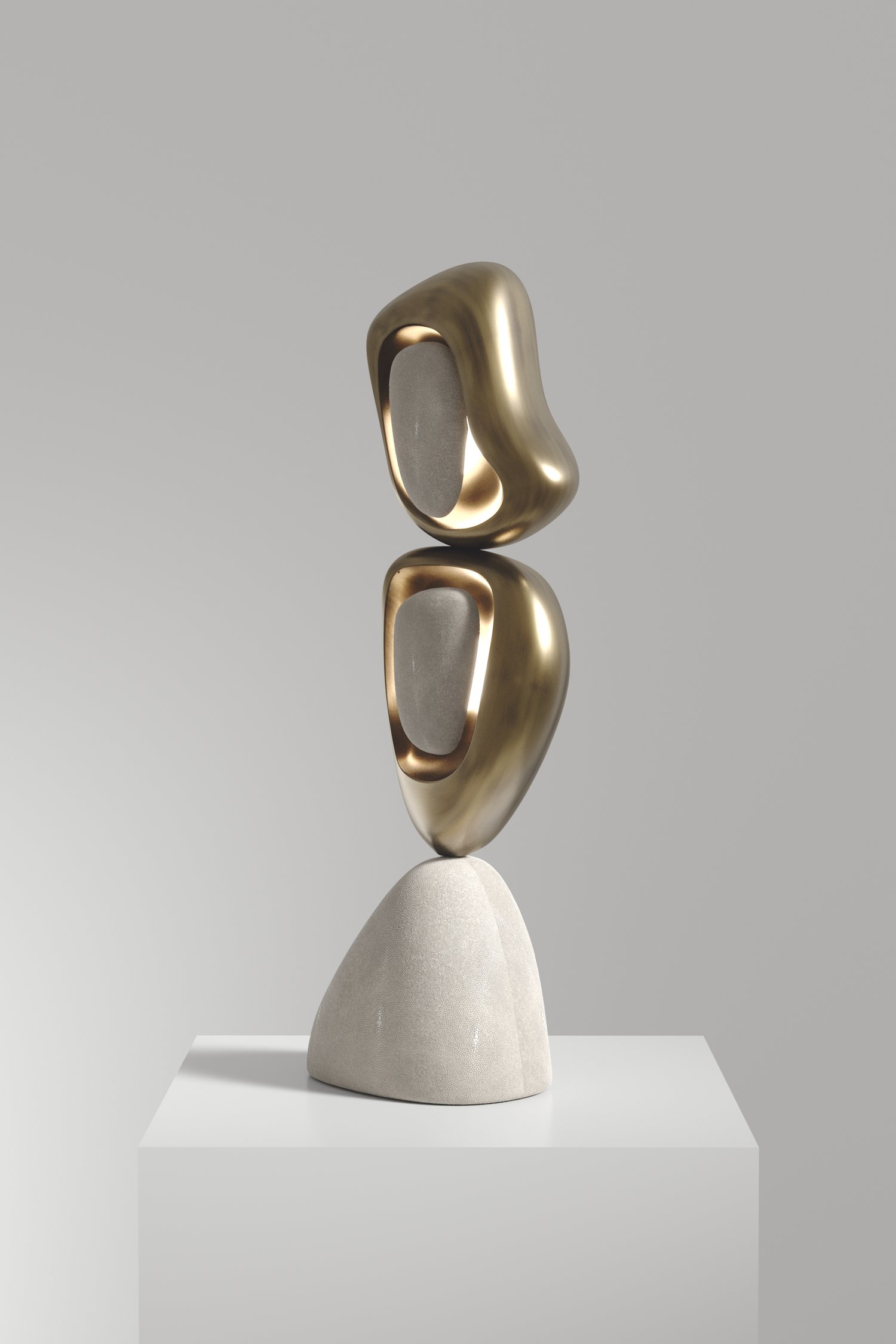 The Owl Table lamp by R & Y Augousti is sculptural piece with a vintage-modern feel. The piece explores bulbous organic curves and cut outs with subtle detailing to create the signature Augousti aesthetic. The suspended parts covering the light source, create a beautiful illusion within the shapes of the piece. The piece is inlaid in a mixture of shell or shagreen with bronze patina brass. Part of the Owl capsule, see images at end of slide.