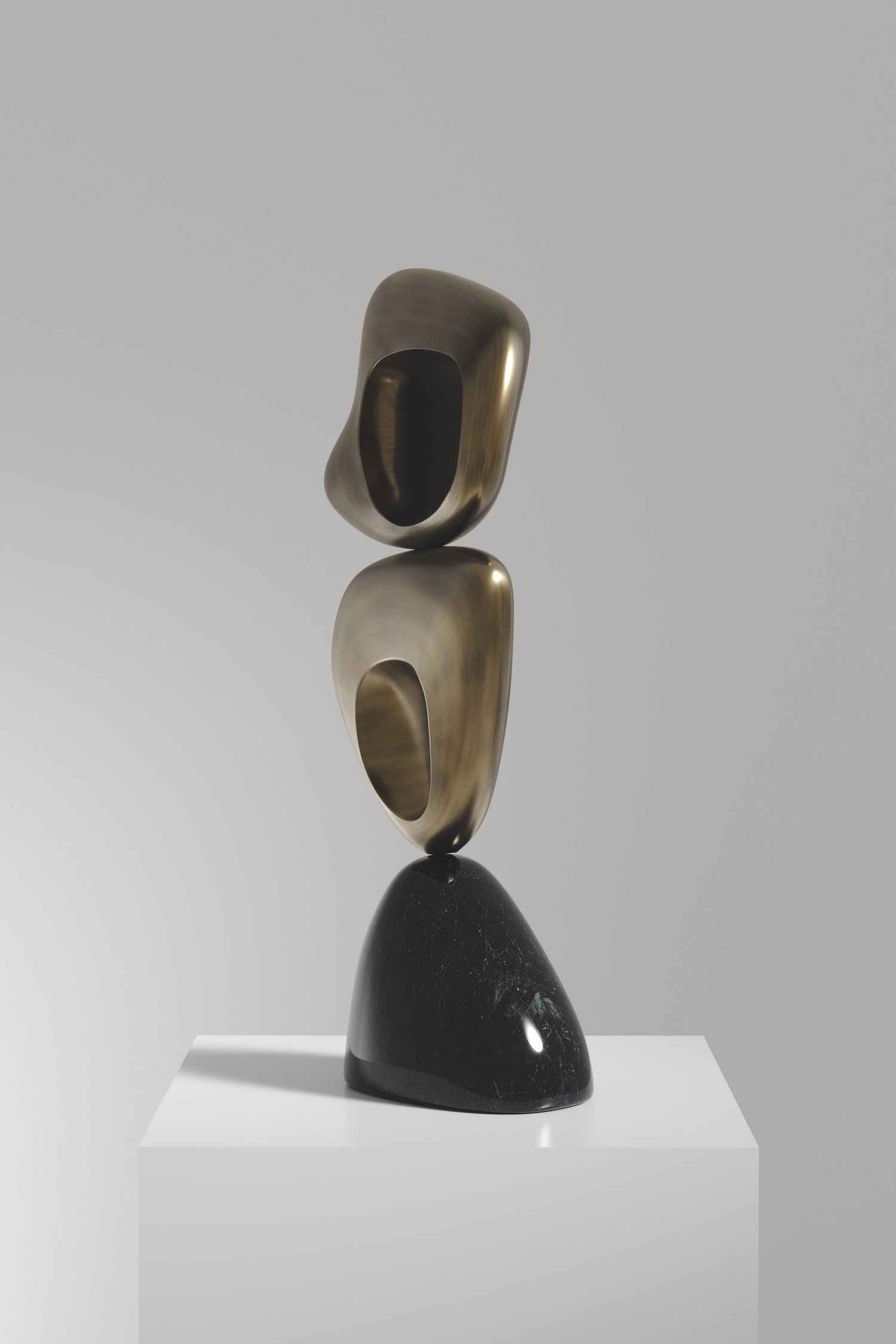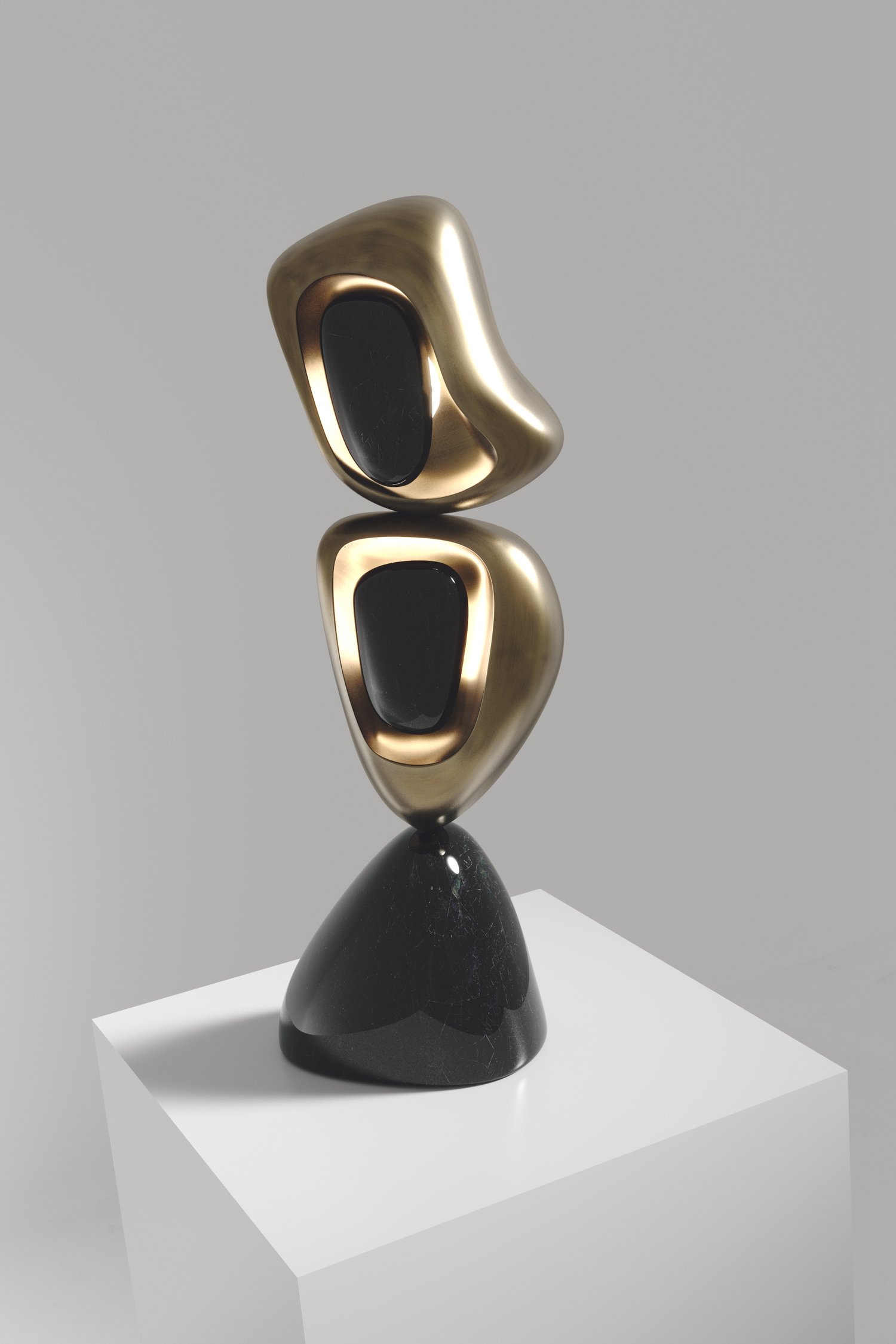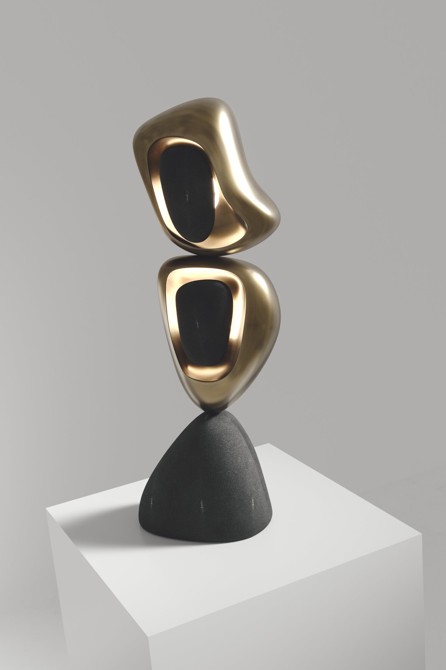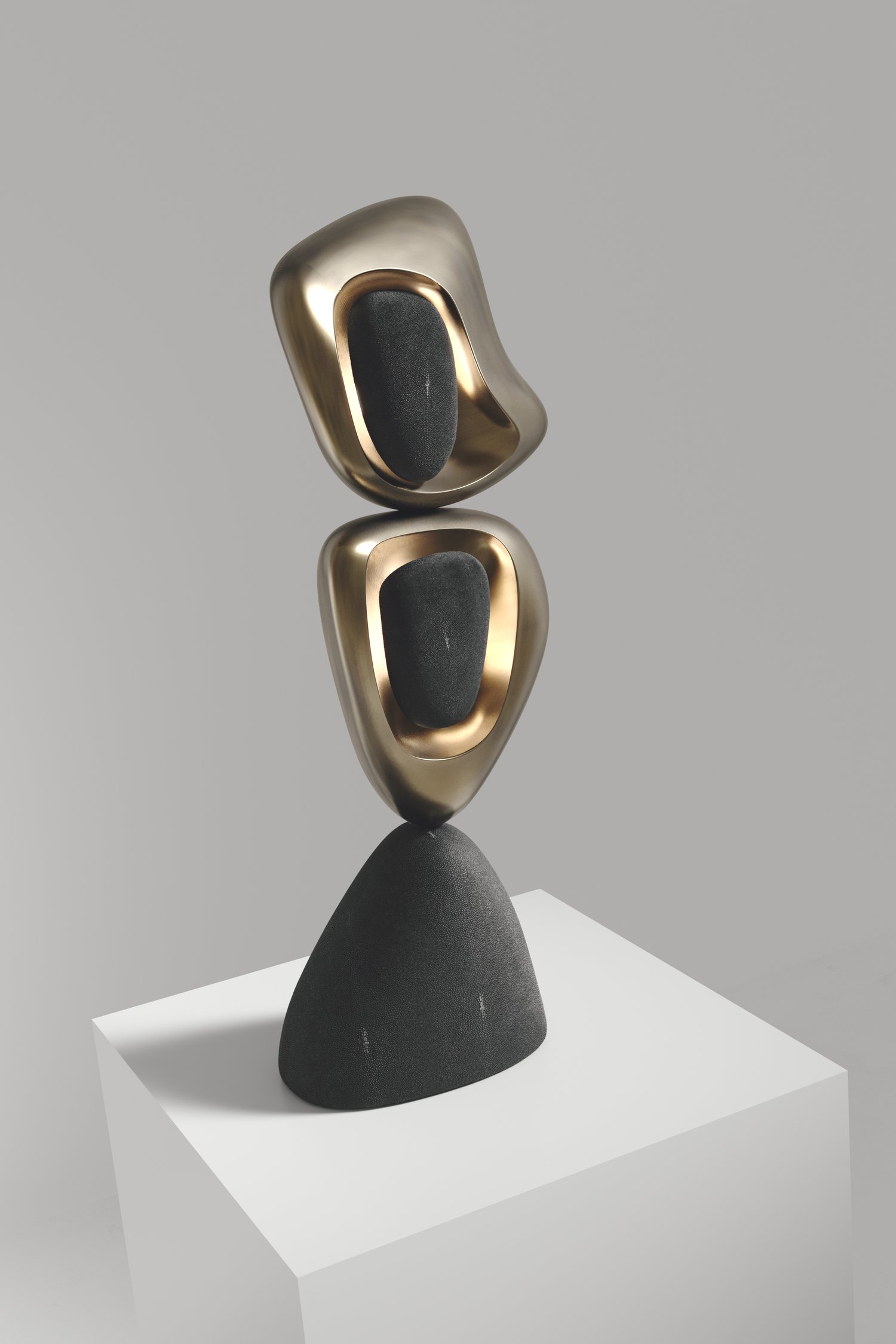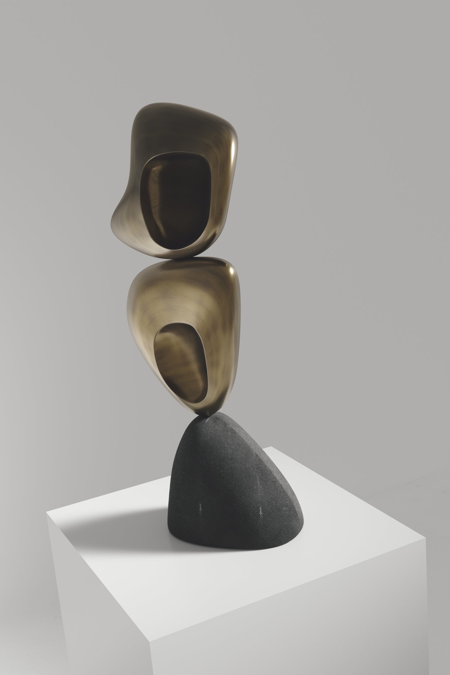 The Owl Table lamp by R & Y Augousti is sculptural piece with a vintage-modern feel. The piece explores bulbous organic curves and cut outs with subtle detailing to create the signature Augousti aesthetic. The suspended parts covering the light source, create a beautiful illusion within the shapes of the piece. The piece is inlaid in a mixture of shell or shagreen with bronze patina brass. Part of the Owl capsule, see images at end of slide.
