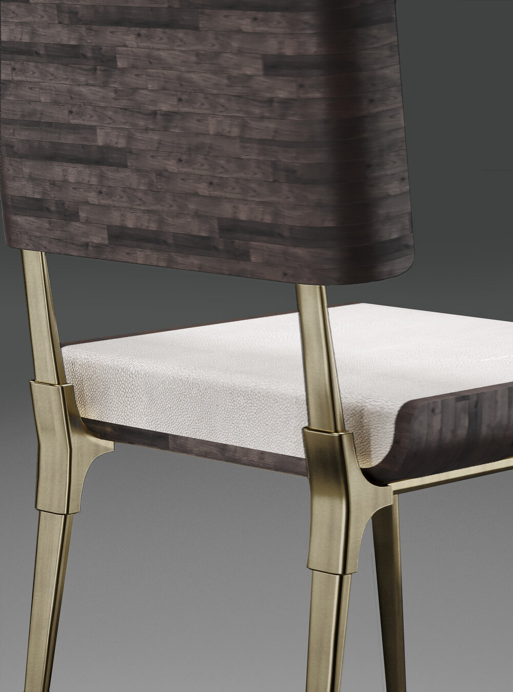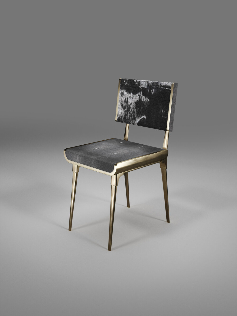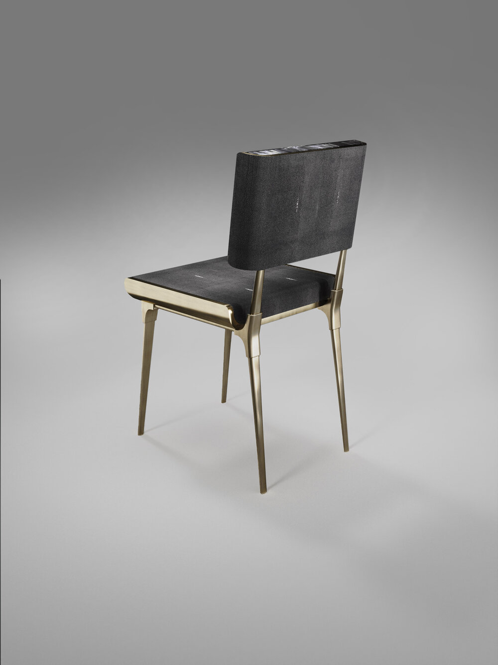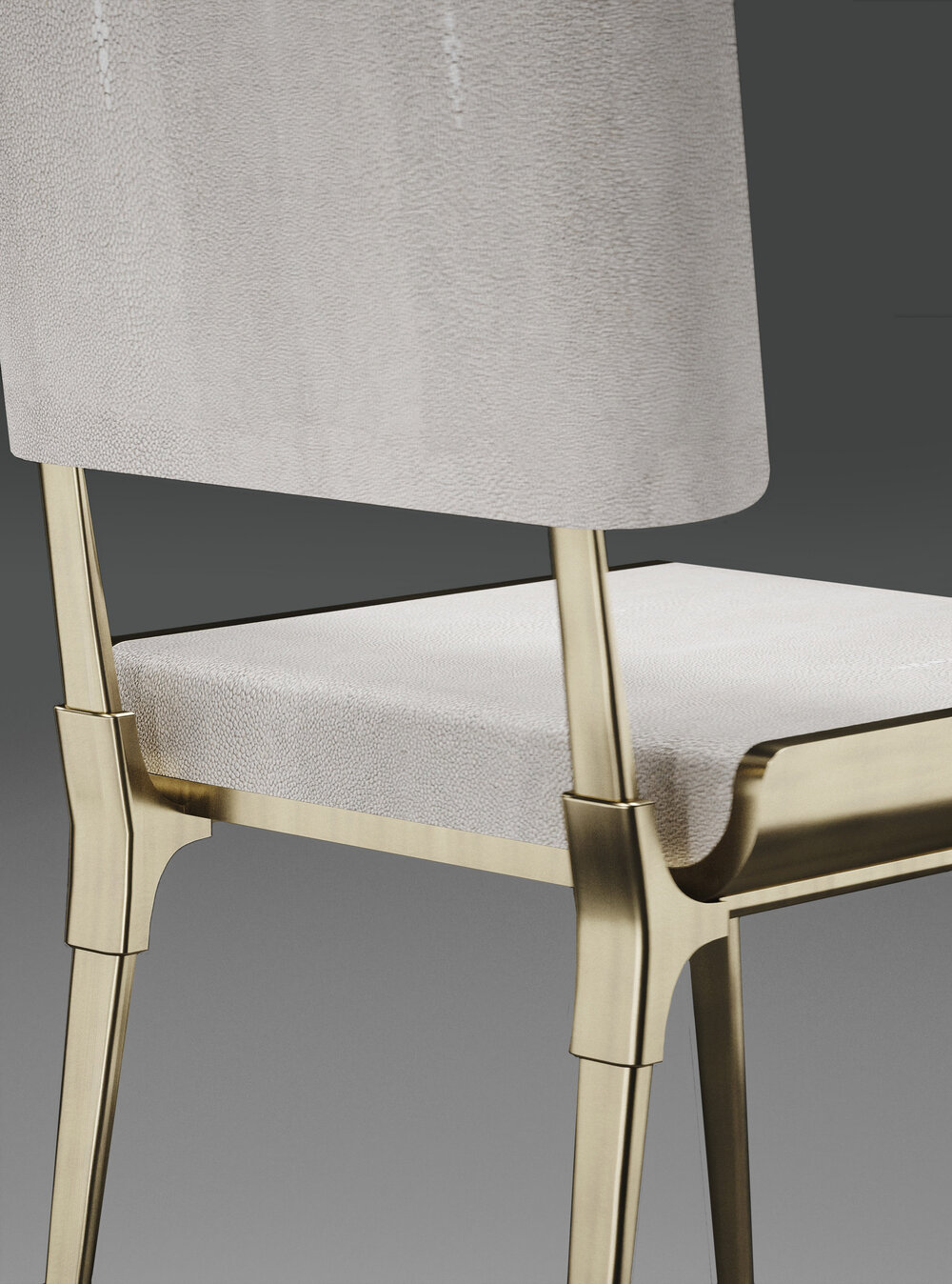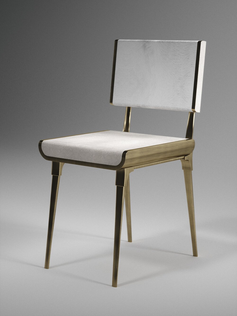 Inspired by the original Dandy Bench by KIFU PARIS, the Dandy II Chair is the ultimate luxury seating for a dining room or corner area. The seating area is inlaid in cream shagreen and the legs, frame and sides of the chair are inlaid in bronze-patina brass. The backrest is upholstered with white vachette. Other versions are also available as part of the Dandy II Capsule.