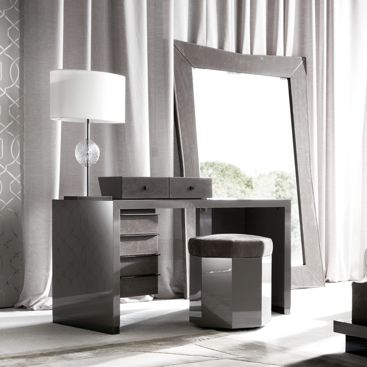 Vanity desk in high gloss polyester grey lacquer w/4 with fronts in natural protected nubuk leather, botton part in velvet fabric. Bases and handles bin black nickel steel.