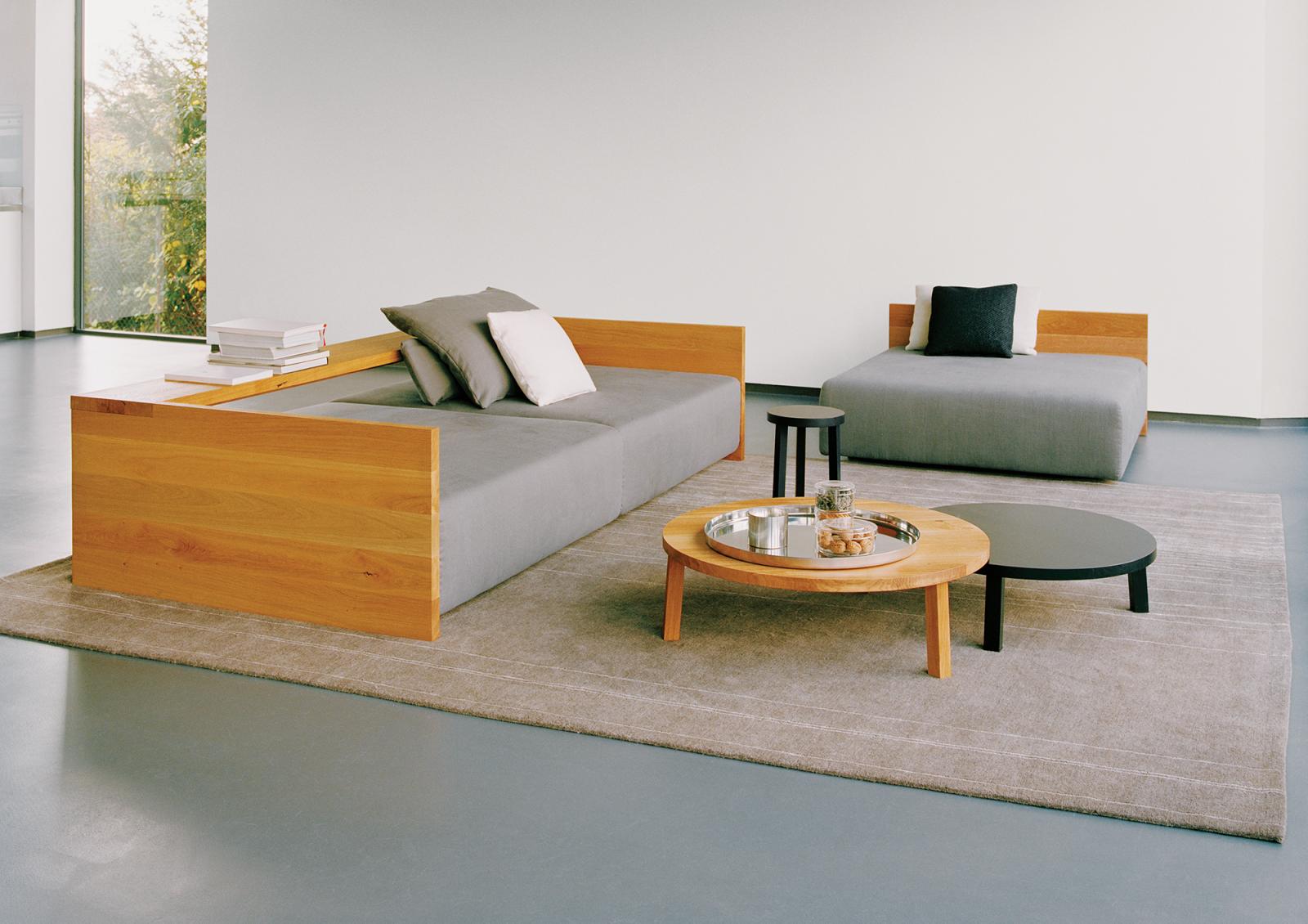 With its rounded, minimalistic forms, the LEILA coffee table supplies a compelling contrast to the rectangular structure of sofas and chairs. Given its different size options, the LEILA possesses exceptional versatility. LEILA is available in selected materials, such as solid European oak and walnut. The oak version is also available in colour stained and matt varnished surface tones. This combination produces a capturing effect by allowing the natural wood grain patterns to shimmer forth from beneath the varnish, highlighting the origin and authenticity of the materials. The ideal companions of the LEILA are the tables ALEX and the HABIBI tray.